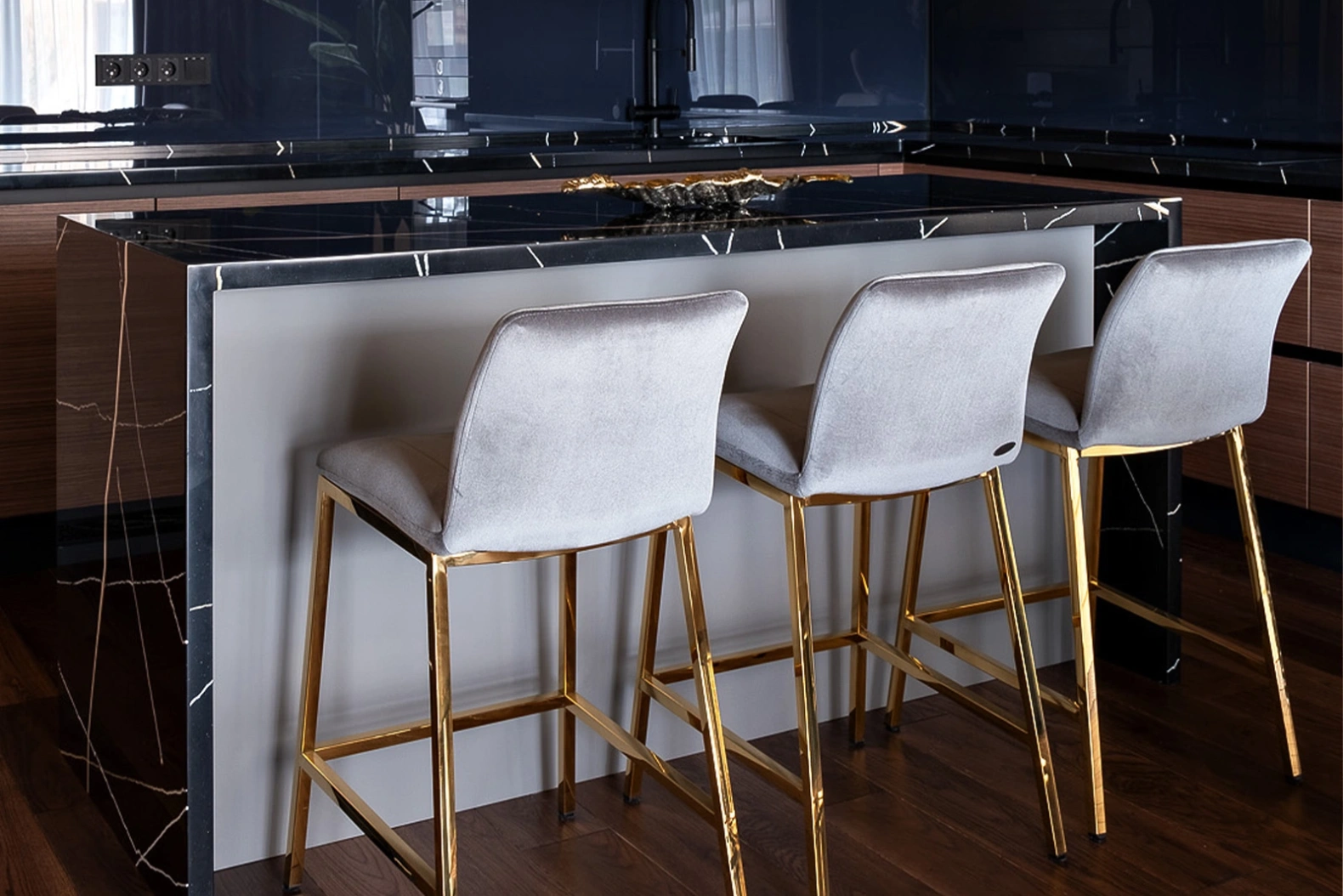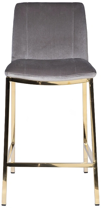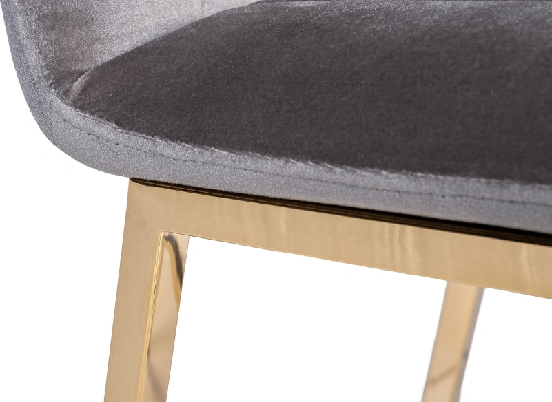 Удобный барный стул из сергого велюра на позолоченном основании из нержавеющей стали. Серый велюровый барный стул – стильный и элегантный в своем дизайне. Его сложно назвать универсальным, поскольку красота этой модели предъявляет высокие требования к общей обстановке кухни, бара, ресторана. Барный стул со спинкой воплощает в себе повышенный комфорт и способен занять центральное место в интерьере. Обивка из тактильно приятного велюра и ножки из позолоченного металла делают эту модель весьма заметной и привлекательной. Габариты сиденья: ширина 42см, глубина 38см, высота от пола 65см.
