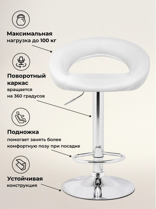 Белый корпус стула гармонично сочетается с хромированными деталями, создавая ощущение лёгкости и воздушности. Мягкая обивка обеспечивает удобство и комфорт даже во время длительного пребывания за барной стойкой.