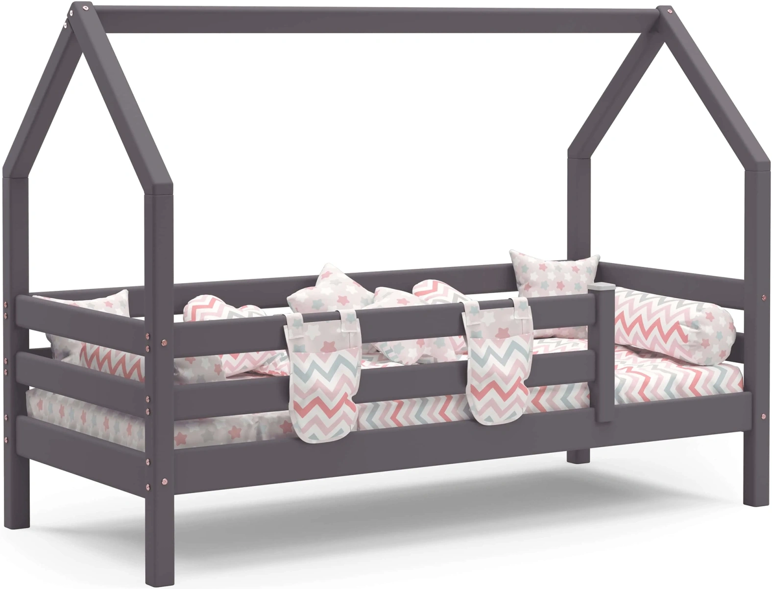 Уложить разыгравшегося ребенка бывает непросто – справиться с этой задачей поможет кроватка "Соня" с надстройкой в виде крыши домика. Дополненный текстильными элементами балдахин создает ощущение безопасности, настраивает на спокойствие, а в дневное время – может служить декорациями для пробуждающих воображение игр. Бортик по периметру защищает от случайного падения во сне.