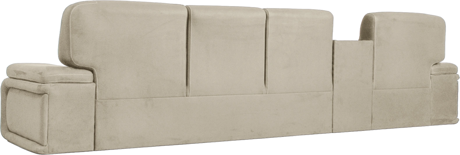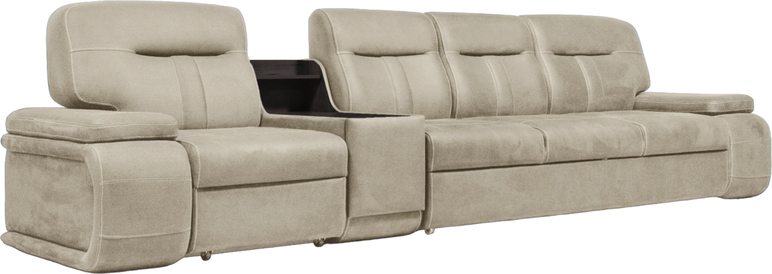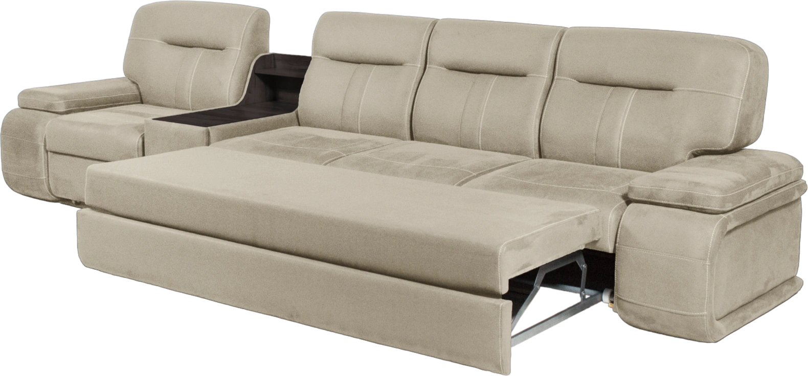 Модульный диван с ровным спальным местом и баром справа. Имеет 2 разных функционала. Несмотря на офисный строгий вид этот диван имеет спальное место, пригодное для ежедневного раскладывания.