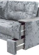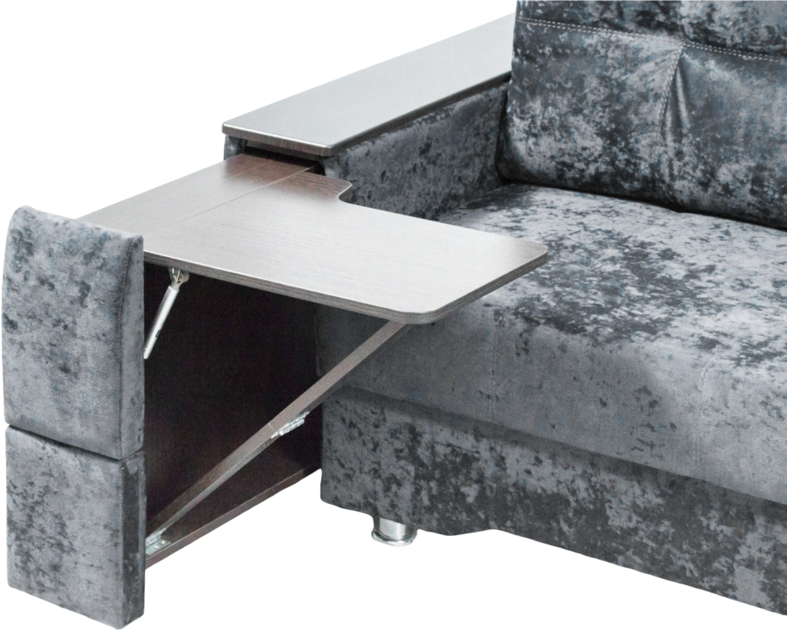 Диван из серии Атлант с современным дизайном, МДФ декором и удобным механизмом раскладывания. Модель выполнена на металлическом каркасе с наполнителем пенополиуретан, который выдерживает высокие нагрузки и быстро восстанавливает форму. Особенность модели - выдвижные ящики для хранения в подолкотниках. Раздвижной столик в стандартных комплектациях идет слева, на заказ можно изготовить столик справа. Модель подходит к интерьеру в цвете венге за счет подлокотников. Стандартная модификация идет со столом слева, но на заказ столик можно изготовить справа.
