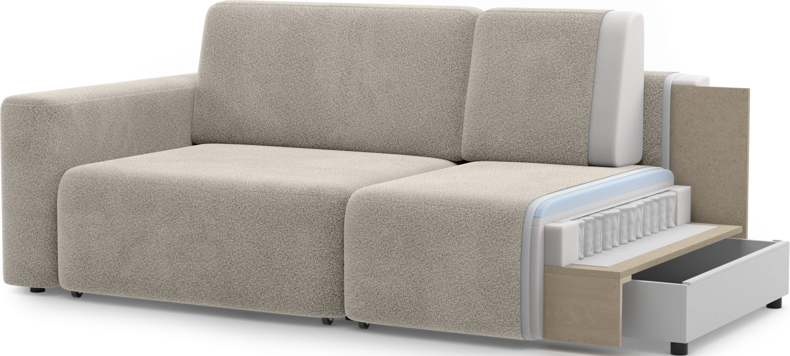Каркас дивана изготовлен из надежных материалов — фанера, ДСП, ДВП, брус и картон — что гарантирует прочность конструкции и устойчивость при эксплуатации.