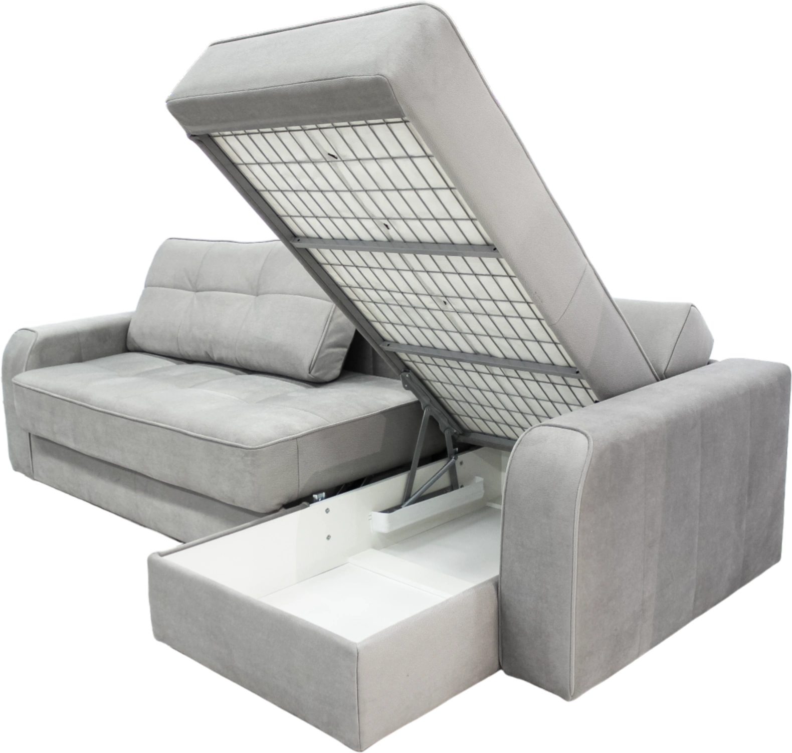 Шагающий механизм трансформации пантограф прост и надежен; при раскладывании не портит напольное покрытие. Модель также оборудована двумя вместительными бельевыми ящиками: в диване и оттоманке.