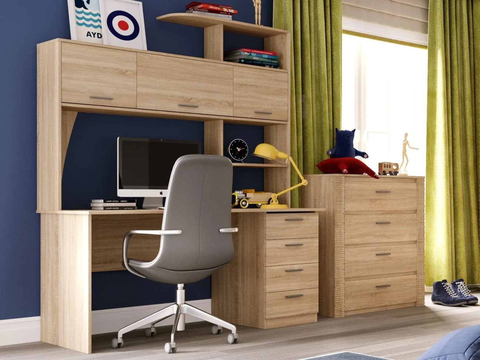 В состав коллекции входят: шкаф однодверный, шкаф угловой, шкаф двухдверный, комод, стол компьютерный, тумба прикроватная, кровать.