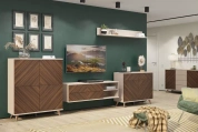 Гостиная Хармони - это воплощение стиля и комфорта. Элегантное сочетание бежевого корпуса и древесного фасада создаёт атмосферу гармонии и уюта в интерьере. Благодаря современным механизмам Push to Open дверцы открываются легко и бесшумно, обеспечивая удобство использования и сохраняя эстетичный внешний вид мебели.