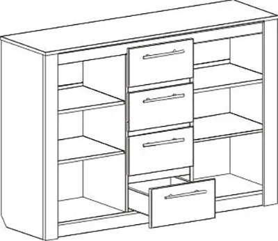 Комод оснащен четырьмя выдвижными ящиками на роликовых направляющих и двумя вместительными отделениями за распашными дверцами.