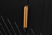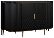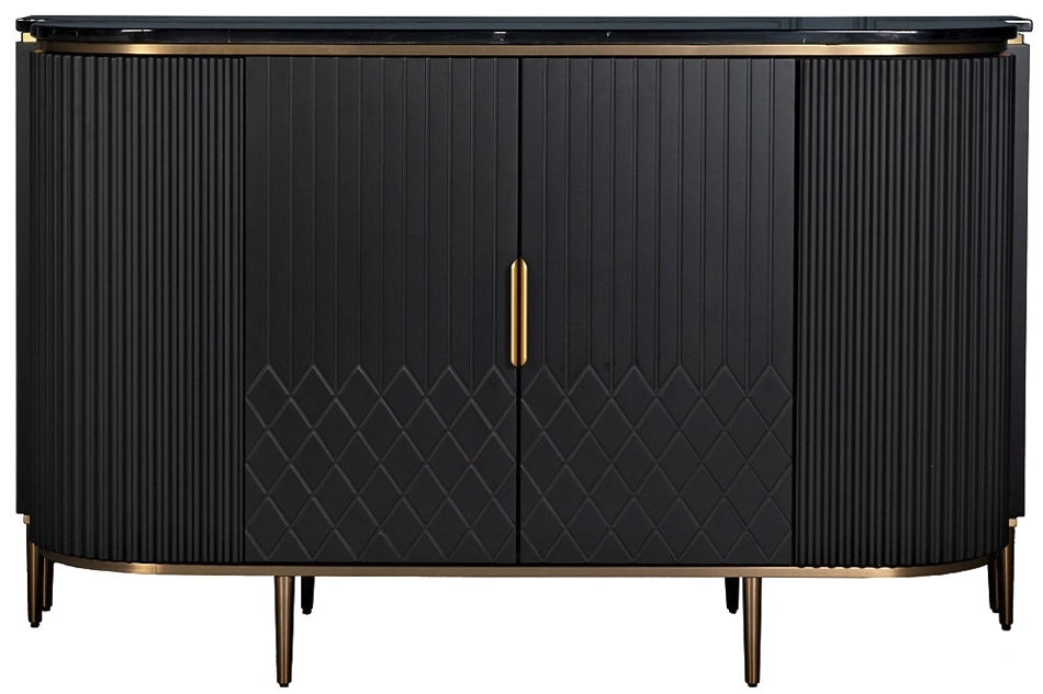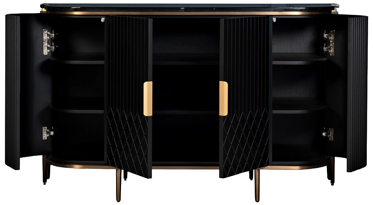 Изысканный черный комод с округлыми формами станет настоящим украшением гостиной или столовой в стиле ар-деко. Рельефные фасады с геометричным узором, напоминающим огранку драгоценного камня, приковывают взгляд и подчеркивают роскошный характер мебели. Изящные ножки и окантовка цвета благородной латуни гармонично сочетаются с глубоким черным цветом корпуса, создавая атмосферу респектабельности и лоска. Прочная столешница из черного стекла добавляет комоду функциональности и изысканности. Округлый комод — не только стильный, но и практичный предмет интерьера, который поможет поддерживать порядок в доме.