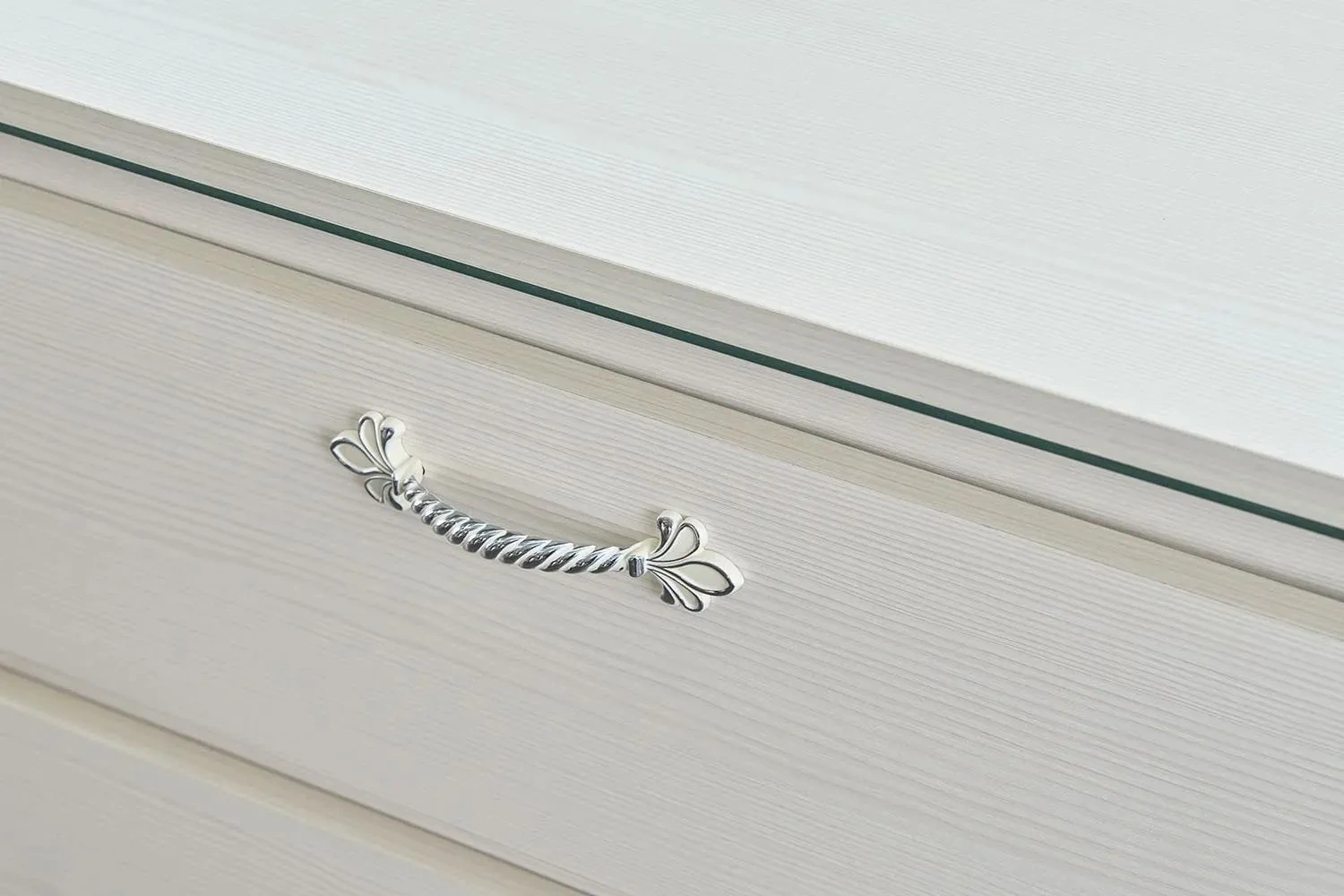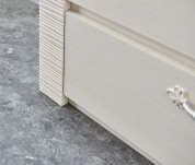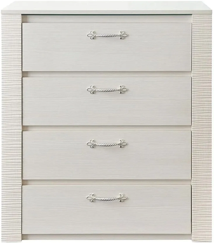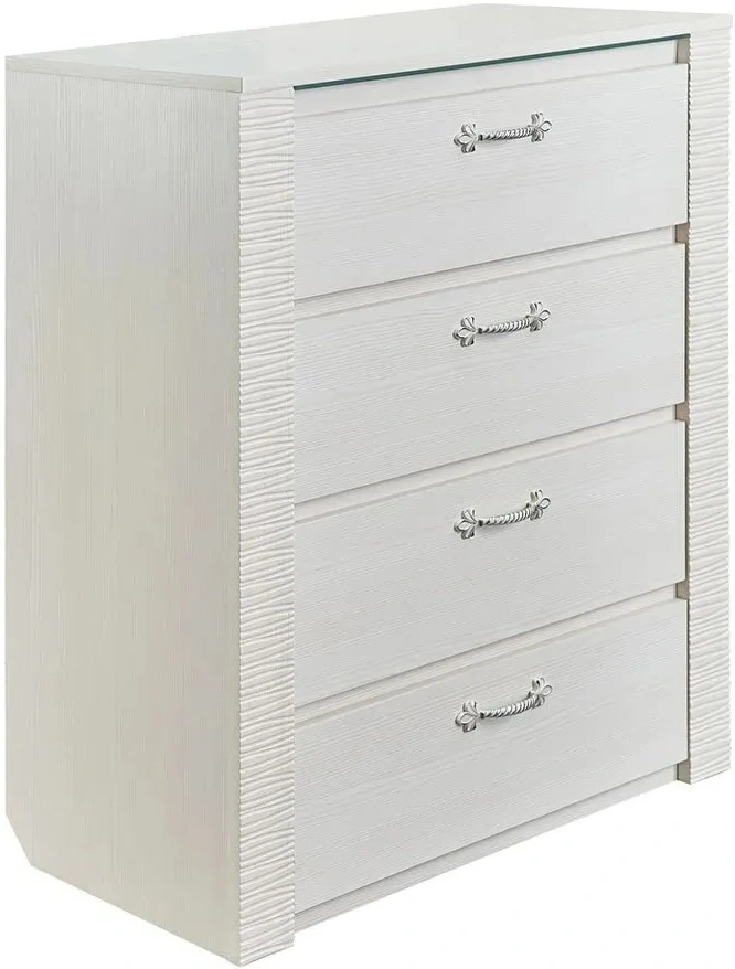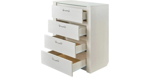 Комод оснащен четырьмя выдвижными ящиками на роликовых направляющих. Под столешницей имеется стеклянная панель (5 мм), предназначенная для установки светильника. Комплект подсветки (светильник и блок питания) приобретается отдельно. Блок питания рассчитан на подключение шести светильников.