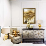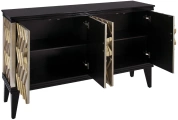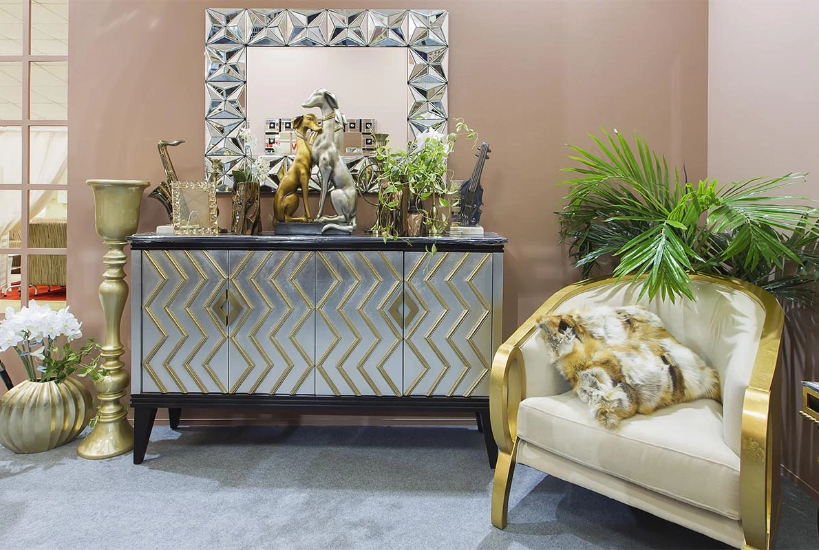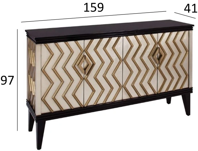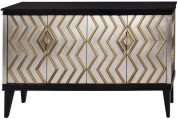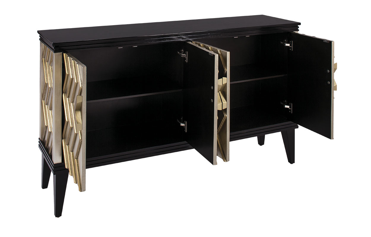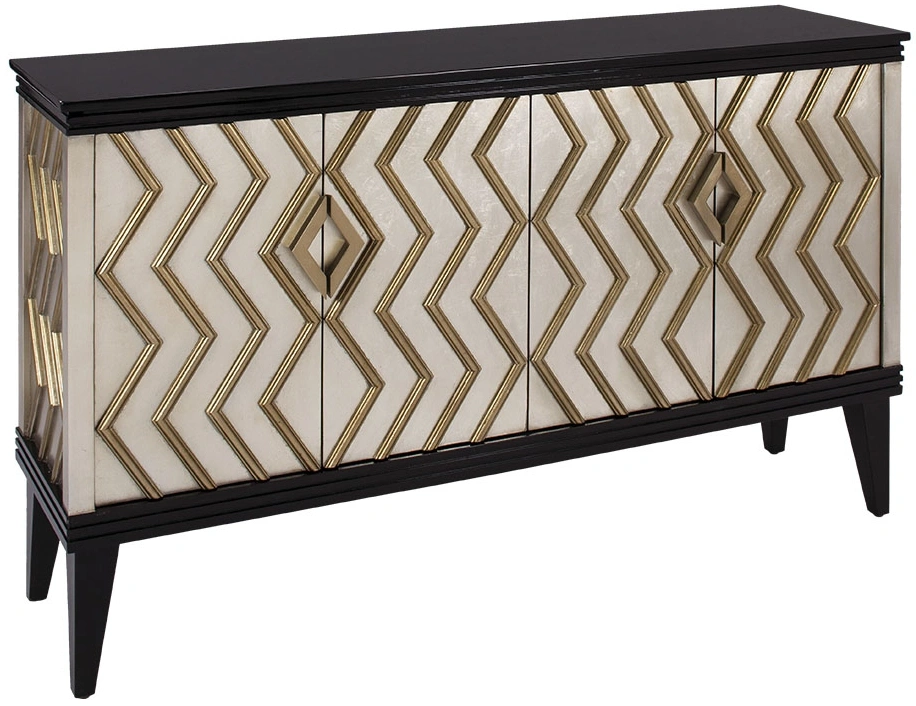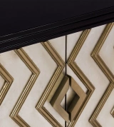 Дизайнерский комод ручной работы с геометрическим рисунком выполнен в духе биметаллической гостиной Форсайтов 10-х годов прошлого века. Фасад корпуса отделан тончайшей фольгой цвета старого золота и серебра и дополнительно прокрашен вручную по специальной технологии; тщательная отделка каждой детали придает ему особую индивидуальность. В комоде два отделения с вместительной полкой и четырьмя дверцами. На столешнице из натурального черного гранита будут великолепно смотреться вазы и изящные безделушки. Комод прекрасно впишется в интерьер в стиле ар-деко, богемный шик или фьюжн, добавляя артистизм и буржуазный лоск в обстановку.