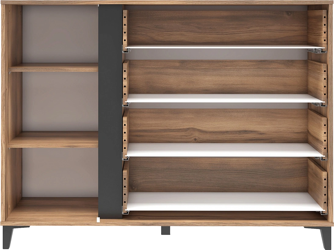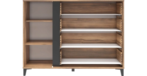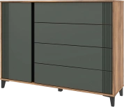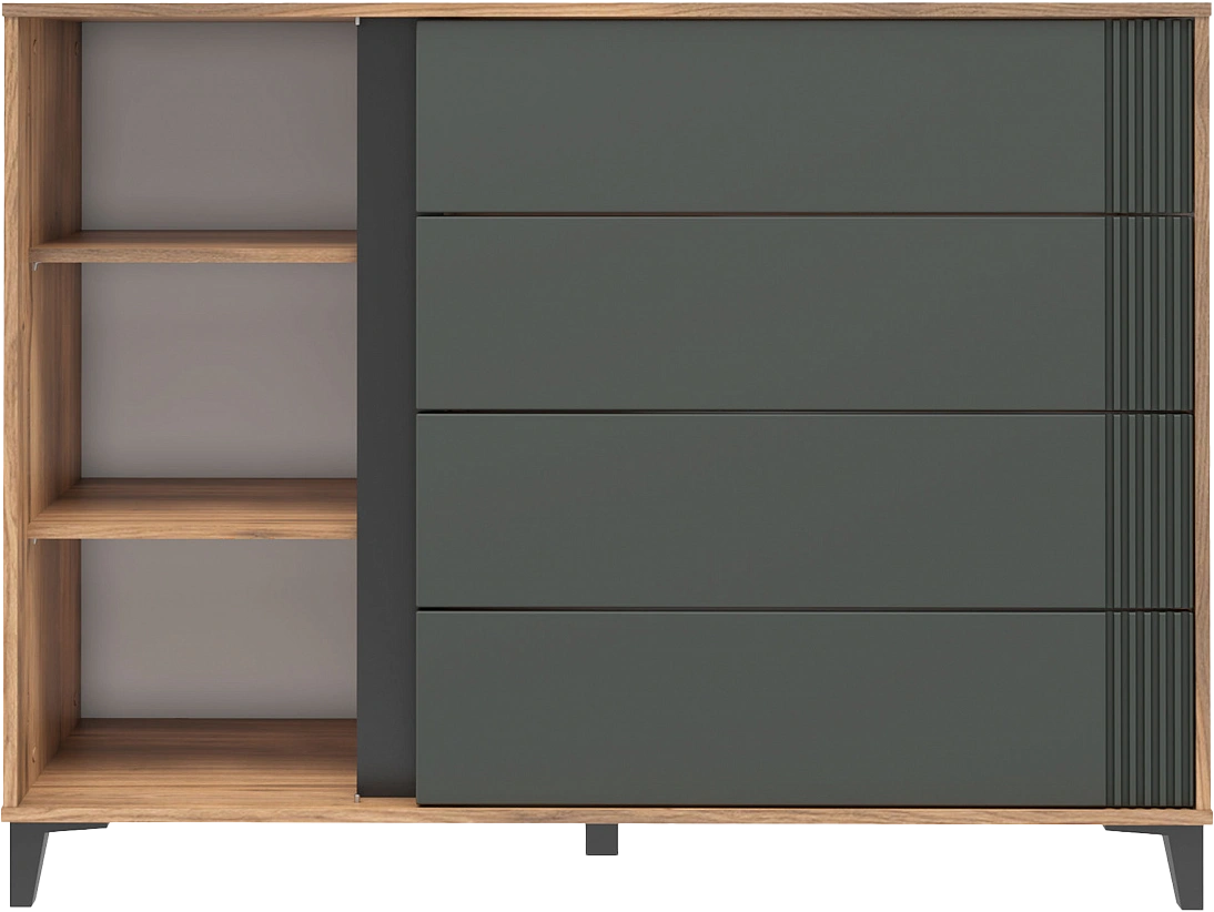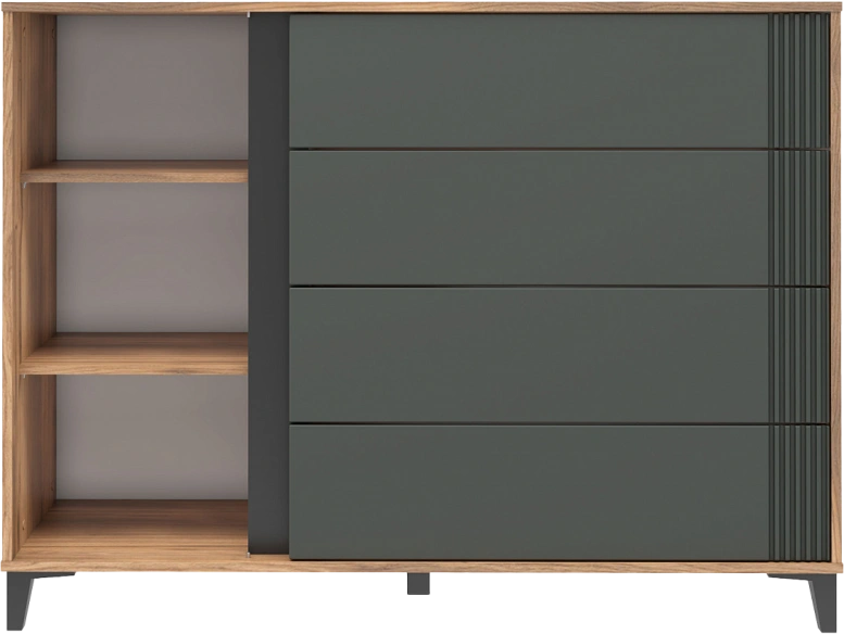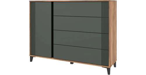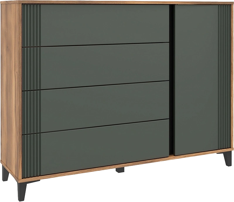 Комод "Богемия" изготовлен из высококачественных материалов. Корпус изготовлен из ламинированной древесностружечной плиты толщиной 16мм. Фасады выполнены из МДФ толщиной 19мм и покрыты пленками ПВХ с эффектом Soft touch. Это обеспечивает не только стильный внешний вид, но и приятные тактильные ощущения.