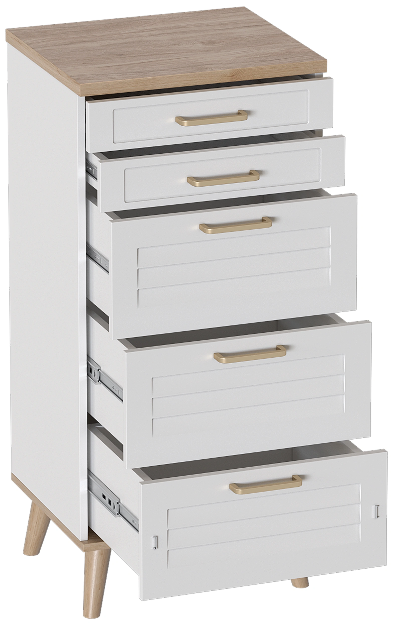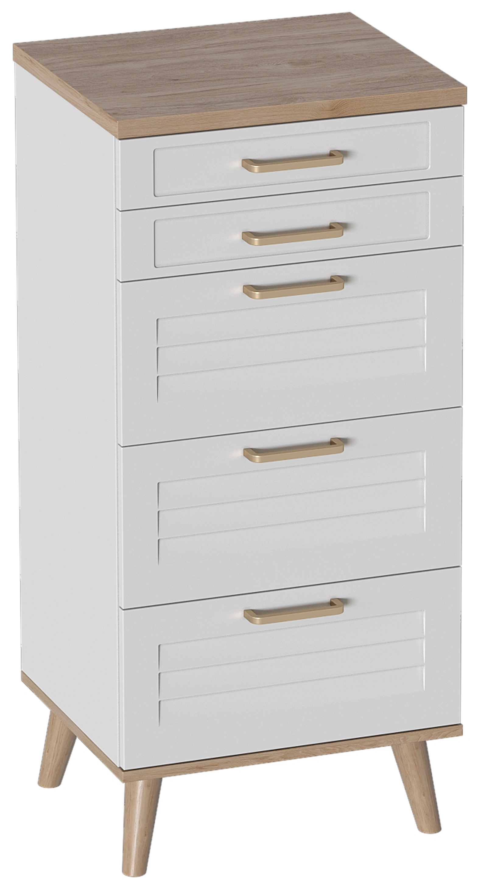 Комод Гавана, на ножках, с пятью ящиками, дуб натуральный светлый / белый матовый