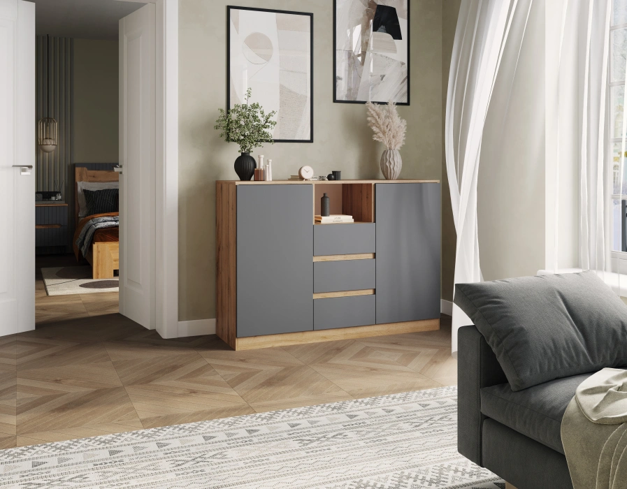 Комод Маллоу-2, с тремя ящиками и полками, дуб вотан / графит софт