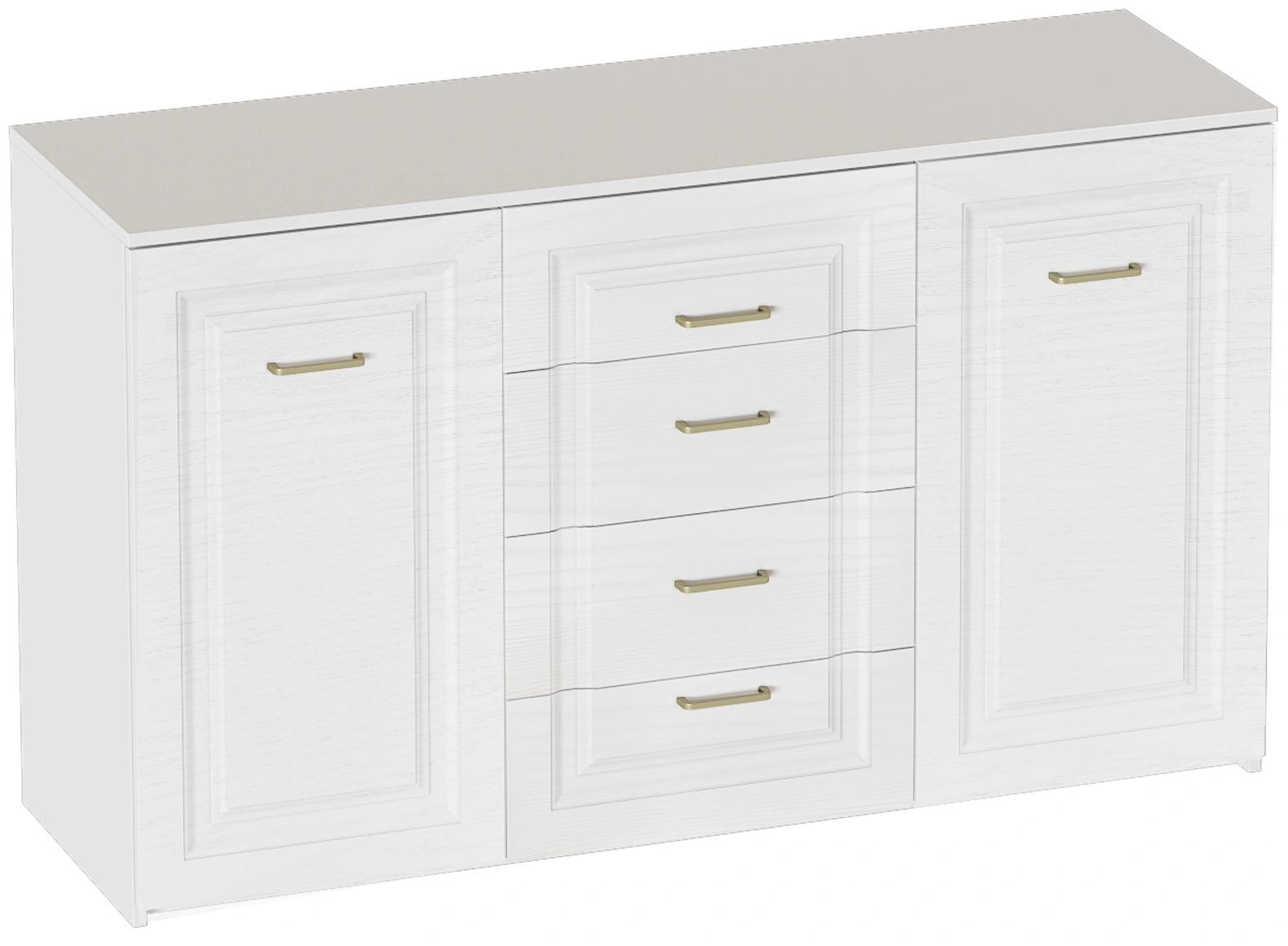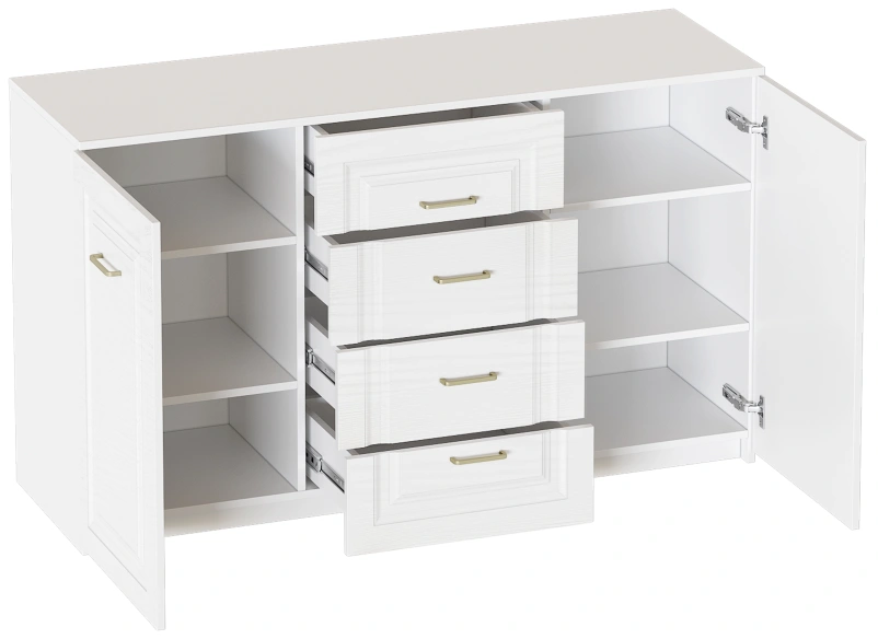 Комод выполнен в цвете Айс 06 / Белый Аляска. Классическая фрезеровка фасадов и ручки-скобы из брашированного золота придают изделию особый шарм и элегантность. Комод с полупроходными боками, прямоугольной крышкой и дном. Внутри пространство разделено на три секции. В средней секции расположены 4 ящика на шариковых направляющих без доводчика, крайние секции закрыты распашными дверями на петлях с доводчиком, за которыми расположены съемные полки. Дно и задние стенки выполнены из ХДФ. На опорах размещены войлочные подпятники.