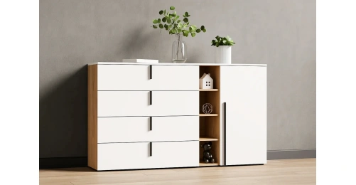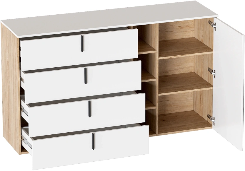Внутри комода пространство разделено на 3 секции, в левой находится 4 ящика на шариковых направляющих. Средняя секция - открытая с полками. Правая секция закрыта распашной дверью, за которой расположены 2 стационарные полки.