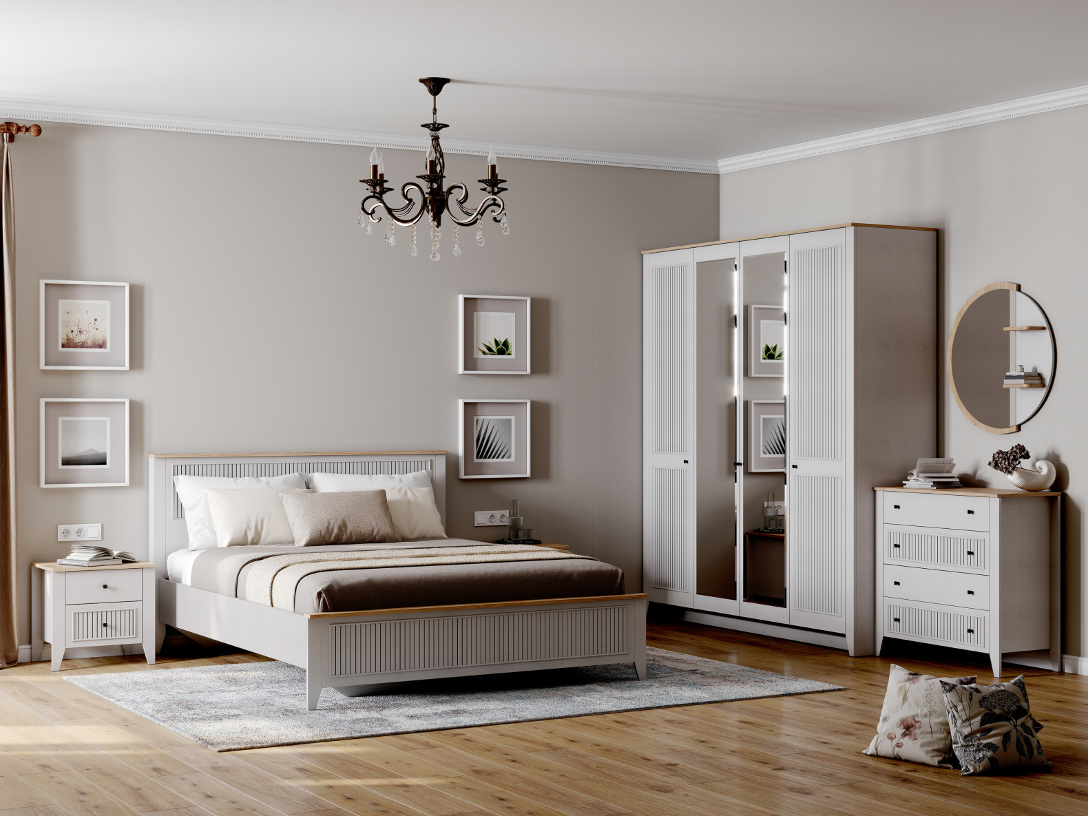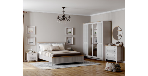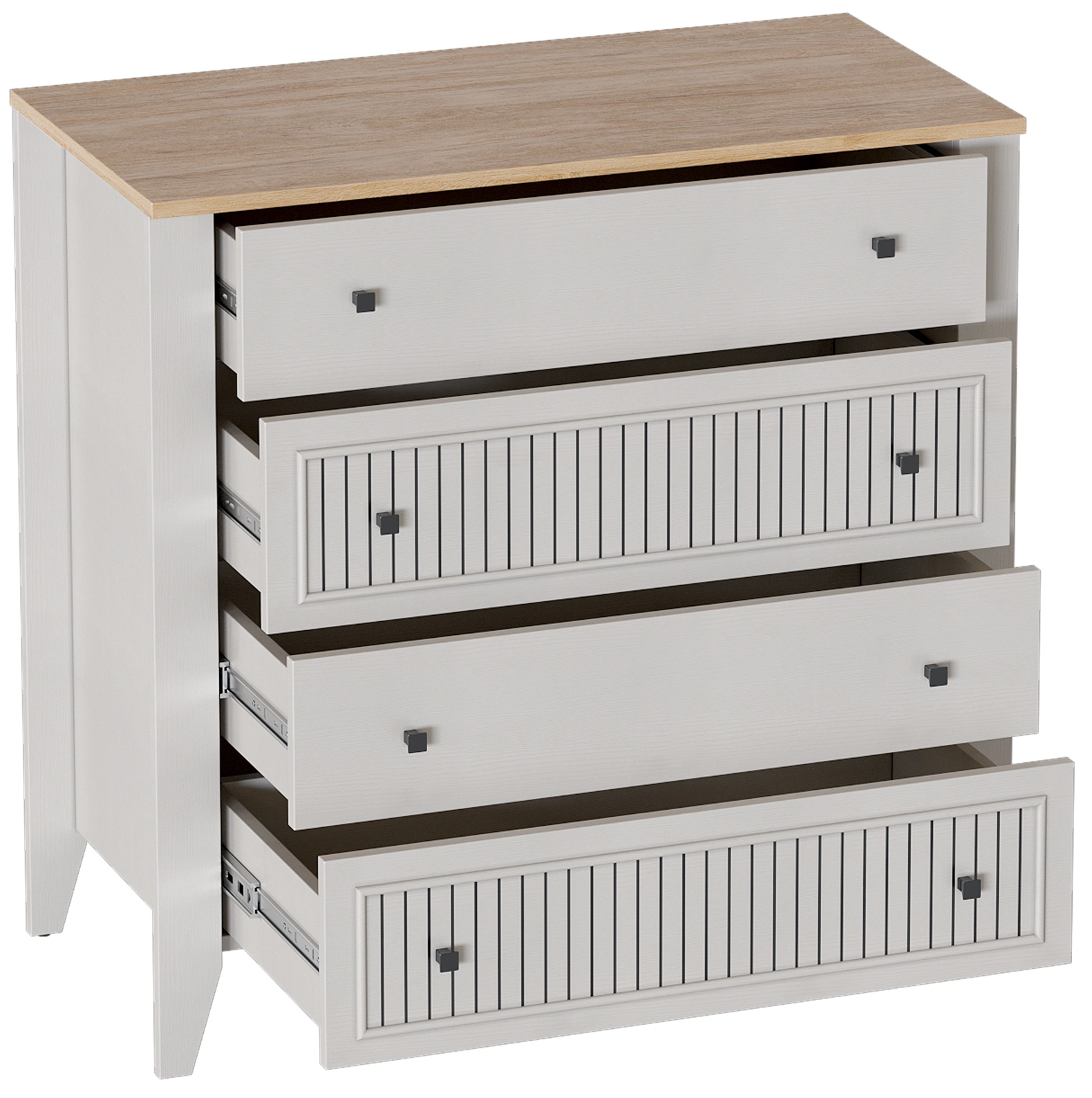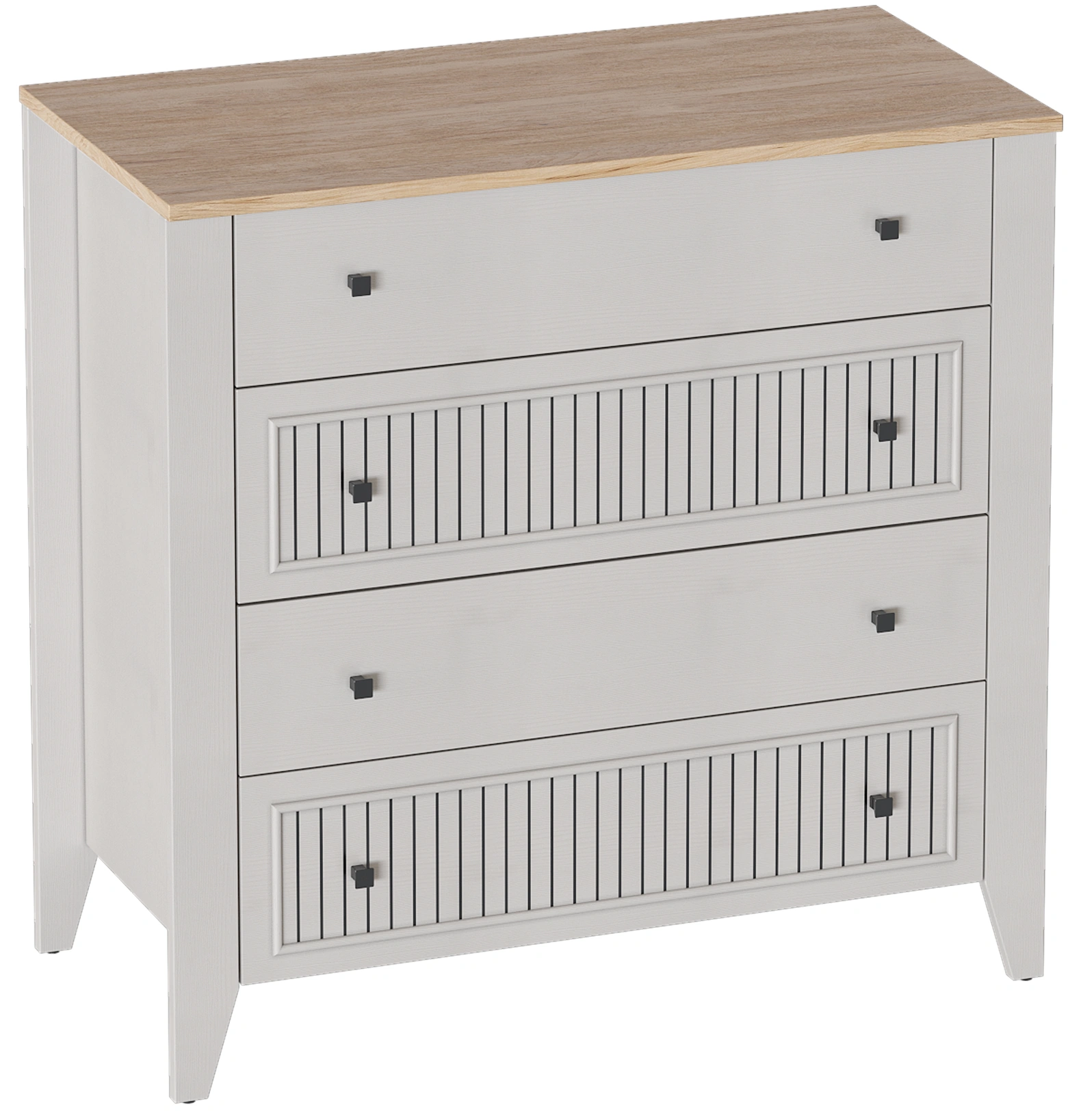 Комод с 4 ящиками Валенсия выполнен из (ЛДСП) в комбинации Дуб натуральный светлый / Персидский жемчуг.