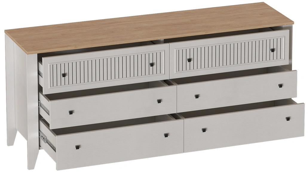 Комод "Валенсия" выполнен в комбинации Дуб натуральный светлый / Персидский жемчуг и состоит из выдвижных ящиков на шариковых направляющих (без амортизаторов), что позволяет удобно хранить вещи и поддерживать порядок в комнате. Он выполнен из безопасных, качественных материалов, что гарантирует долговечность и сохранение первоначального вида на протяжении долгого времени.