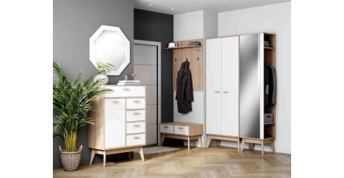 Высокий комод "Калгари" – это продуманная система хранения для прихожей, которая поможет избавиться от беспорядка. Закрытое отделение с двумя полками идеально подходит для хранения уличной и домашней обуви. Четыре выдвижных ящика предоставляют достаточно места для множества мелочей и аксессуаров, таких как обувь, зонты, перчатки, ключи и многое другое.
