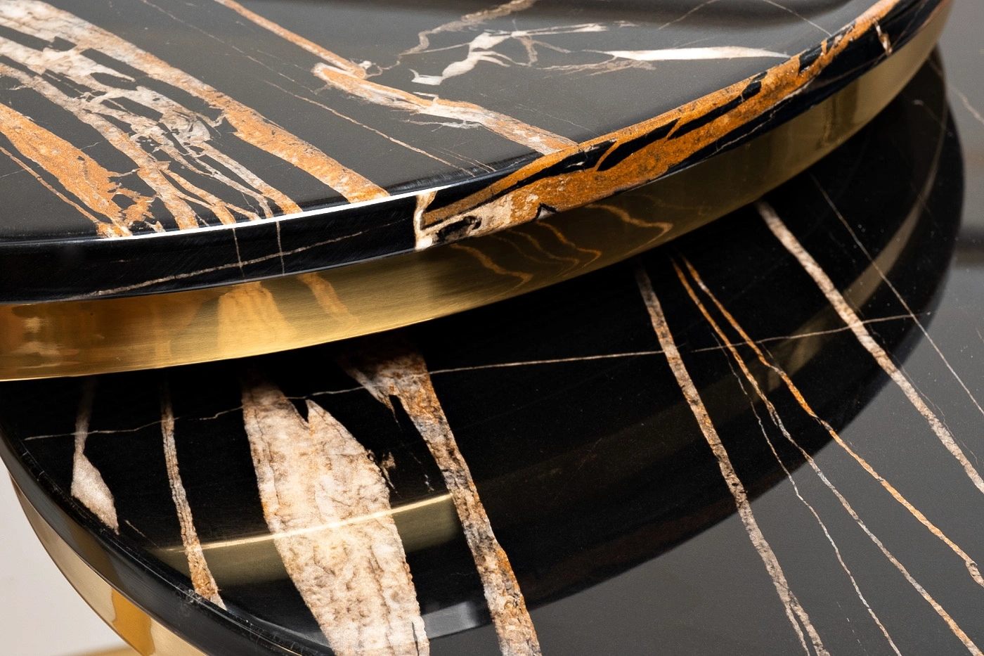 Комплект журнальных столов для гостиной – удачный выбор для гостиной, кабинета или спальной. Эти круглые журнальные столы немного различаются размерами. В результате один из них удобно задвигается под другой, экономя пространство. При необходимости столики можно раздвинуть, если у вас намечаются гости. Такой набор журнальных столов выглядит необычайно стильно и презентабельно. Мебель выполнена со вкусом, отвечает современным требованиям качества. Оригинальная опора из полированной нержавеющей стали золотого цвета эффектно сочетается со столешницей из черного искусственного мрамора с цветными прожилками.