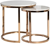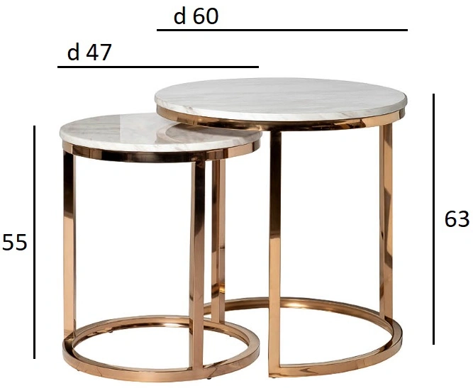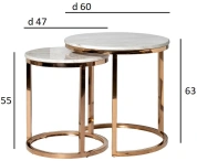 Комплект журнальных столов для гостиной – удачный выбор для посиделок с друзьями или семьей. Предметы сделаны по принципу матрешек. Эти круглые журнальные столы немного различаются размерами. В результате один из них удобно задвигается под другой, экономя пространство. При необходимости столики можно раздвинуть, если у вас намечаются гости. Такой набор журнальных столов выглядит необычайно стильно и презентабельно. Мебель выполнена со вкусом, отвечает современным требованиям качества. В состав входит нержавеющая сталь и искусственный мрамор. Высокое качество материалов обуславливает длительную эксплуатацию предметов интерьера без потери их качеств. Максимальная нагрузка на большой столик - 30кг, на маленький - 25кг. Размеры столов - 60х60х63, 47х47х55.