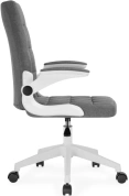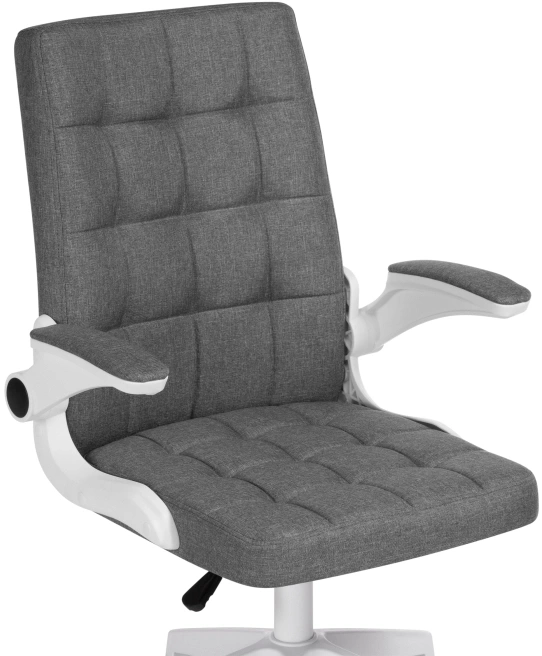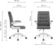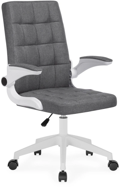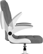Элегантное сочетание белой пластиковой основы и серой тканевой обивки создает лаконичный дизайн, который легко впишется в любой интерьер. Регулируемая высота сиденья (44–52 см) и удобные подлокотники (64–72 см) обеспечивают правильную посадку.