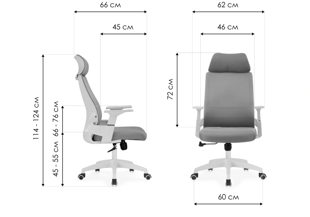 Диаметр крестовины: 60 см. Материал каркаса - Пластик; Материал сиденья - Сетка; Материал ножек - Пластик; Материал обивки - Сетка; Цвет каркаса - Белый; Цвет сиденья - Серый; Цвет ножек - Белый; Цвет обивки - Серый; Ширина - 62; Глубина - 66; Высота - 114; Ширина сиденья - 46; Глубина сиденья - 45; Высота сиденья - 45; Высота спинки - 72; Высота сиденья максимальная - 55; Высота максимальная - 124;