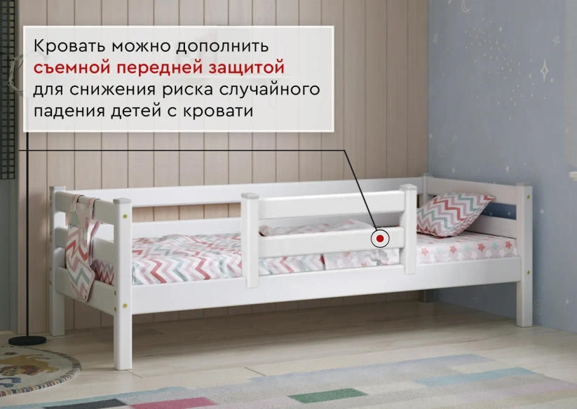 Кровать можно дополнить съемной передней защитой (пакет №5) для снижения риска случайного падения детей с кровати. Матрас и выдвижные ящики приобретаются отдельно.