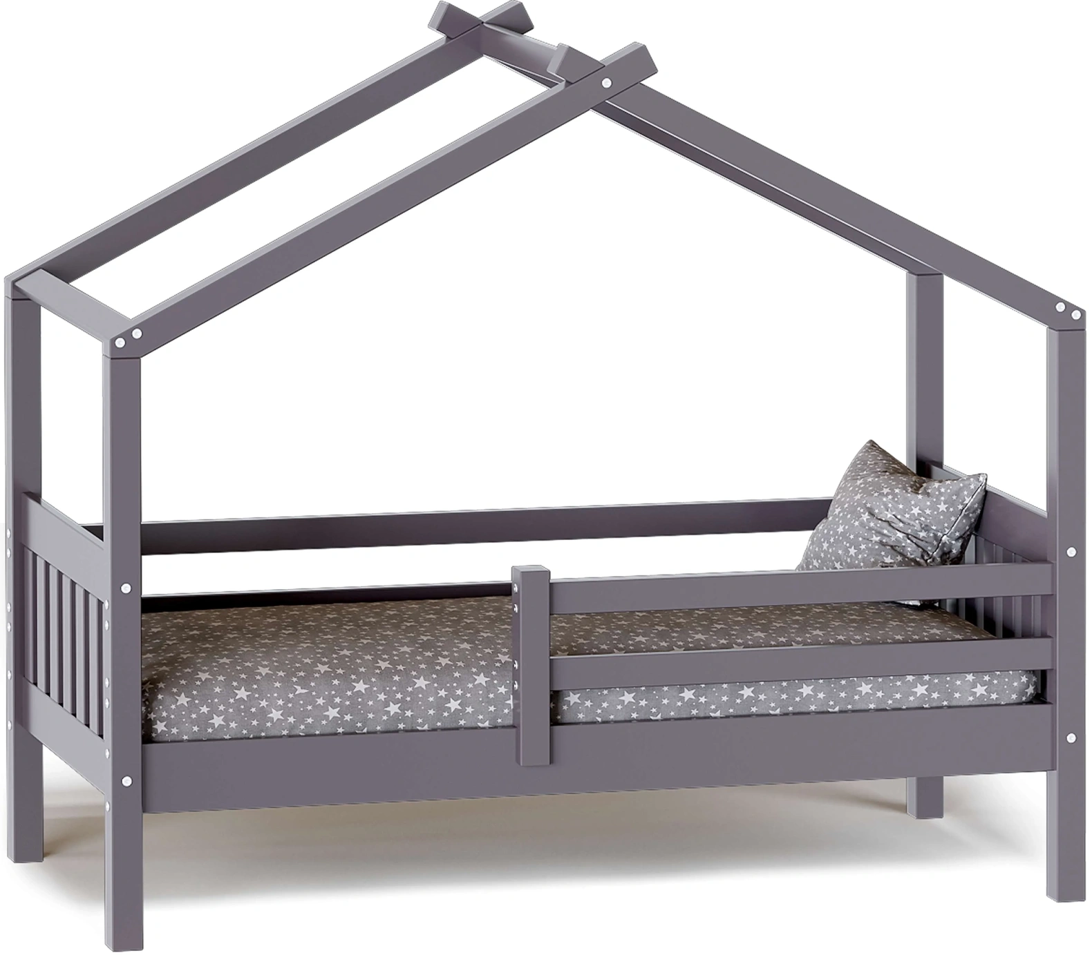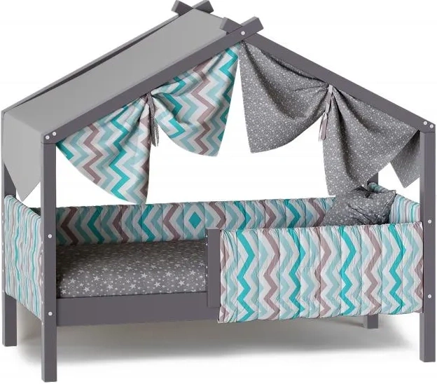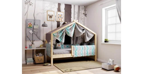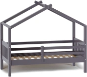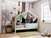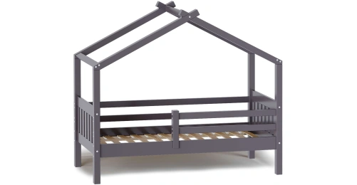 Каркас укомплектован основанием из поперечных гнутых ламелей. Головная и ножная спинки соединены стропилами, образующими крышу: если дополнить кроватку текстильными аксессуарами в виде балдахина и мягких бортиков, малыш будет ощущать себя в собственном уютном домике. В комплектацию кровати входит ортопедическое основание из гнутоклееных ламелей.