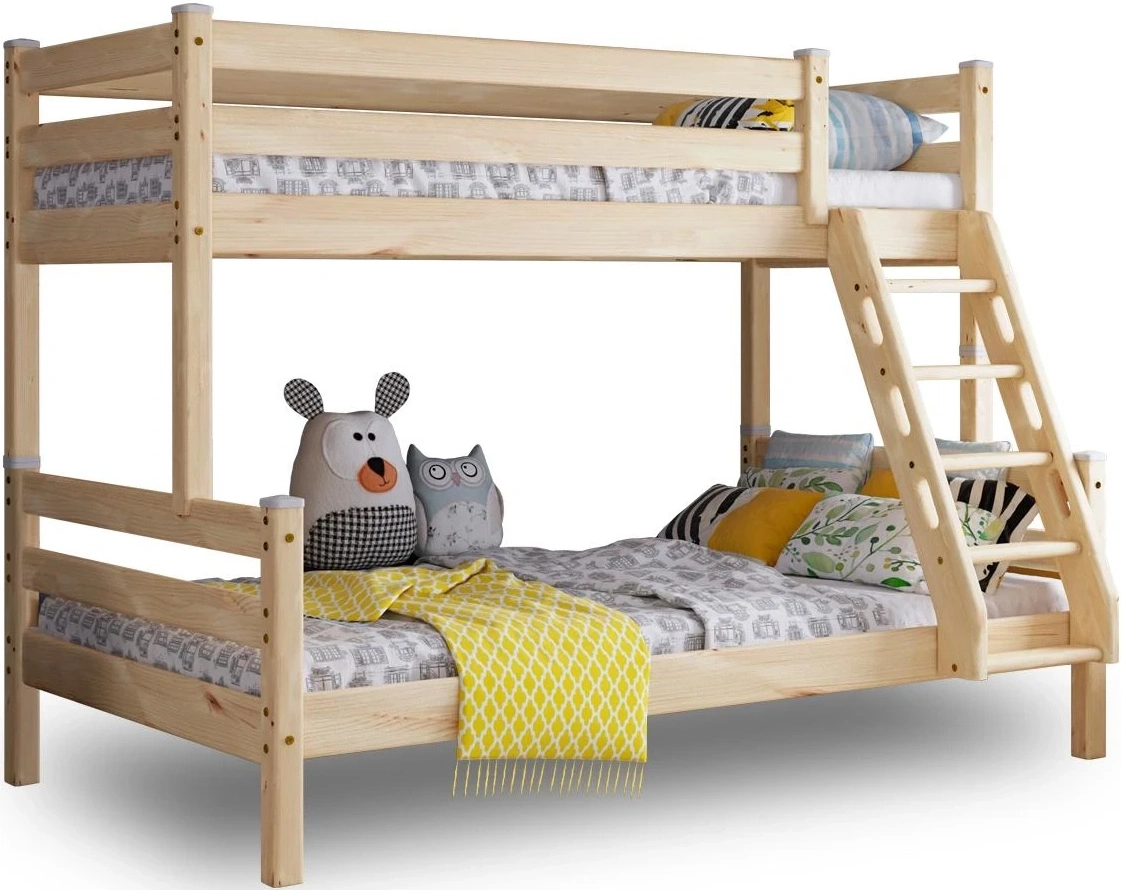 Увеличенное до 120 см по ширине спальное место нижнего яруса подходит для подростка, чей вес не превышает 70 кг. Верхнее основание имеет вид гнутых ламелей, с усиливающей перемычкой по периметру, нижнее представлено опорными брусками с уложенным поверх них настилом из шлифованного МДФ 10мм. Массив сосны подвергнут тщательной шлифовке и покрыт безопасным лаком на водной основе.