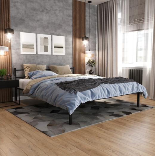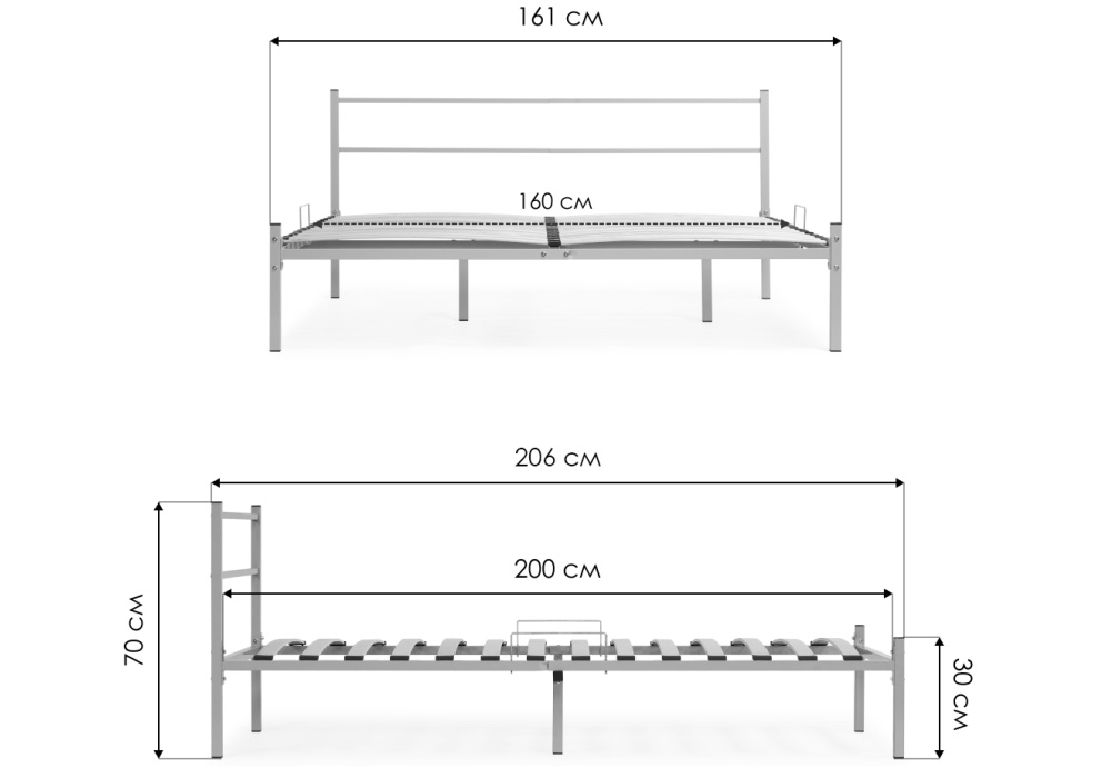 Материал каркаса - Металл; Материал ножек - Металл; Ортопедическое основание - в комплекте; Материал ортопедического основания - с деревянными ламелями; Цвет каркаса - Черный; Цвет ножек - Черный; Ширина - 162; Глубина - 201; Высота - 70; Размер спального места - 160 х 200; Длина кровати - 206; Ширина кровати - 162; Высота изножья - 34;