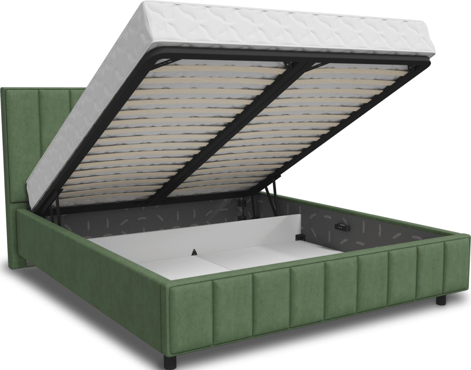 Интерьерная кровать из серии Кордова с подъемным механизмом и цельносварным ортопедическим основанием, а также настилом из ЛДСП для бельевого отсека. Металлическая опора 10 см.