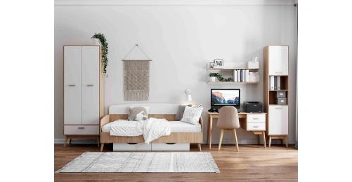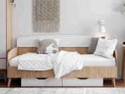Кровать стоит на опорах из массива березы. Основанием матраса является настил из ЛДСП, закрепленный на стойках. Дополнительно может комплектоваться выкатным ящиком на роликовых опорах.