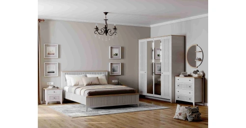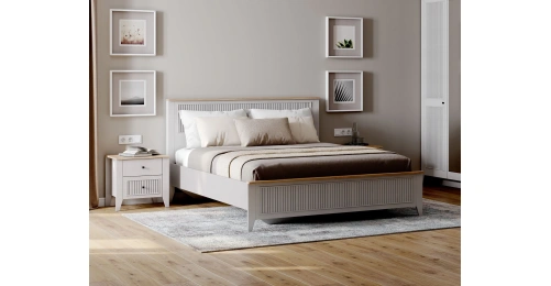Кровать Валенсия выполнена из ЛДСП в комбинации Дуб натуральный светлый / Персидский жемчуг. УФ-фотопечать полосок на изголовье и изножье в обрамлении пластиковых молдингов придает изделию оригинальный стиль современной классики. Кроватное основание с деревянными ламелями встроено в конструкцию кровати. Высота опор 104 мм. На опорах размещены войлочные подпятники