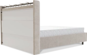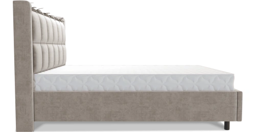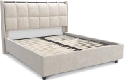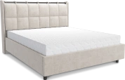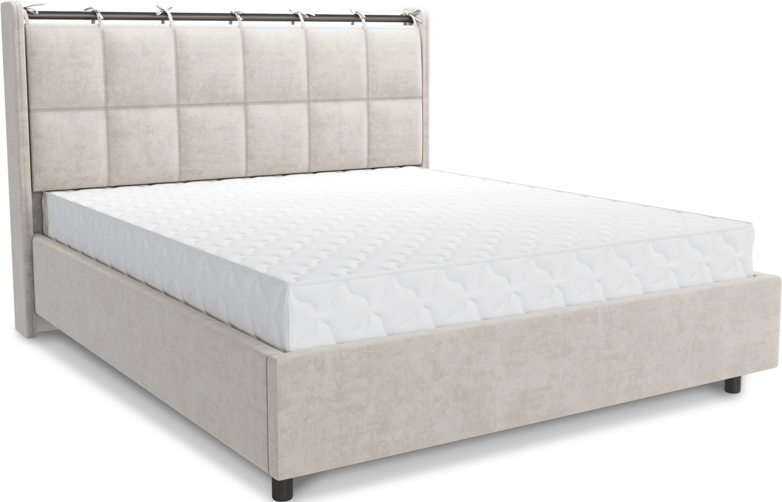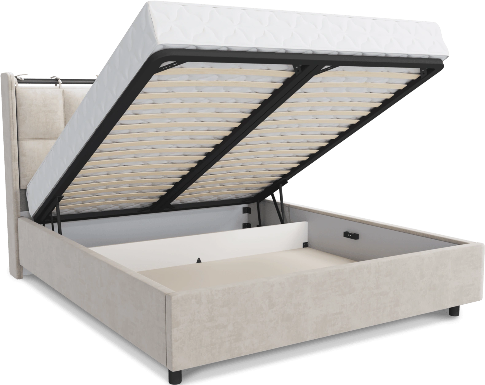 Интерьерная кровать из серии Женева с подъемным механизмом и цельносварным ортопедическим основанием, а также настилом из ЛДСП для бельевого отсека. Металлическая опора 10 см.