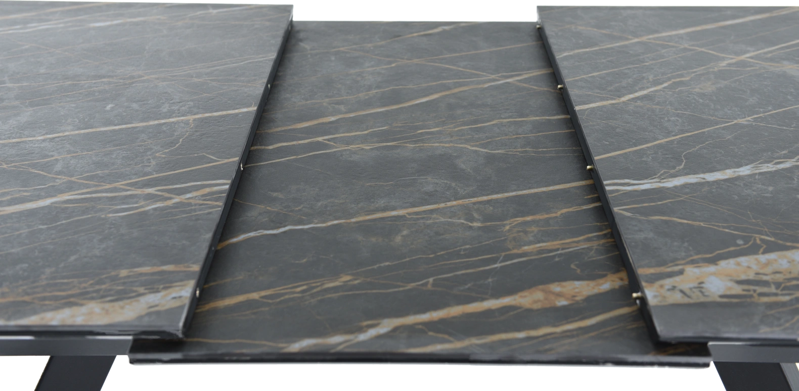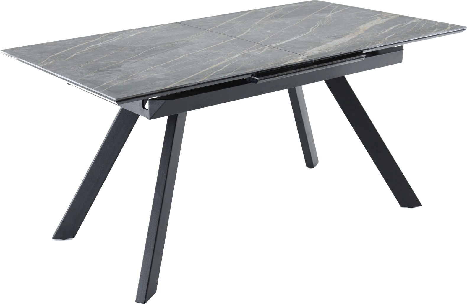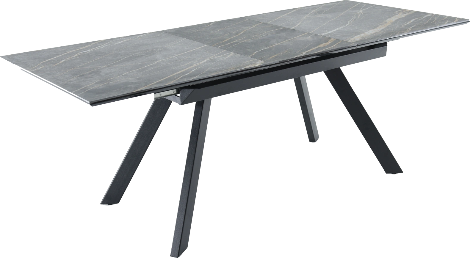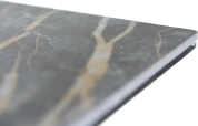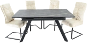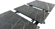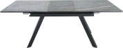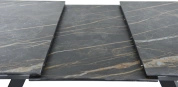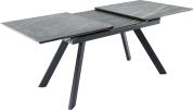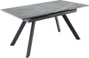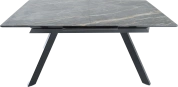 Кухонный стол «Como» со столешницей из искусственного камня, материал - керамогранит Noir desir Bocciardato, на черных металлических опорах. Отличительной чертой этого стола являются изогнутые ножки и синхронный механизм для раскладки стола с подъемным механизмом. Такой механизм успешно себя зарекомендовал и пользуется постоянным спросом у наших покупателей. Стоит отметить еще одну особенность стола «Como» — это выбор, как со столешницей из керамогранита, так и покрытия из закаленного, матового стекла OPTI.
