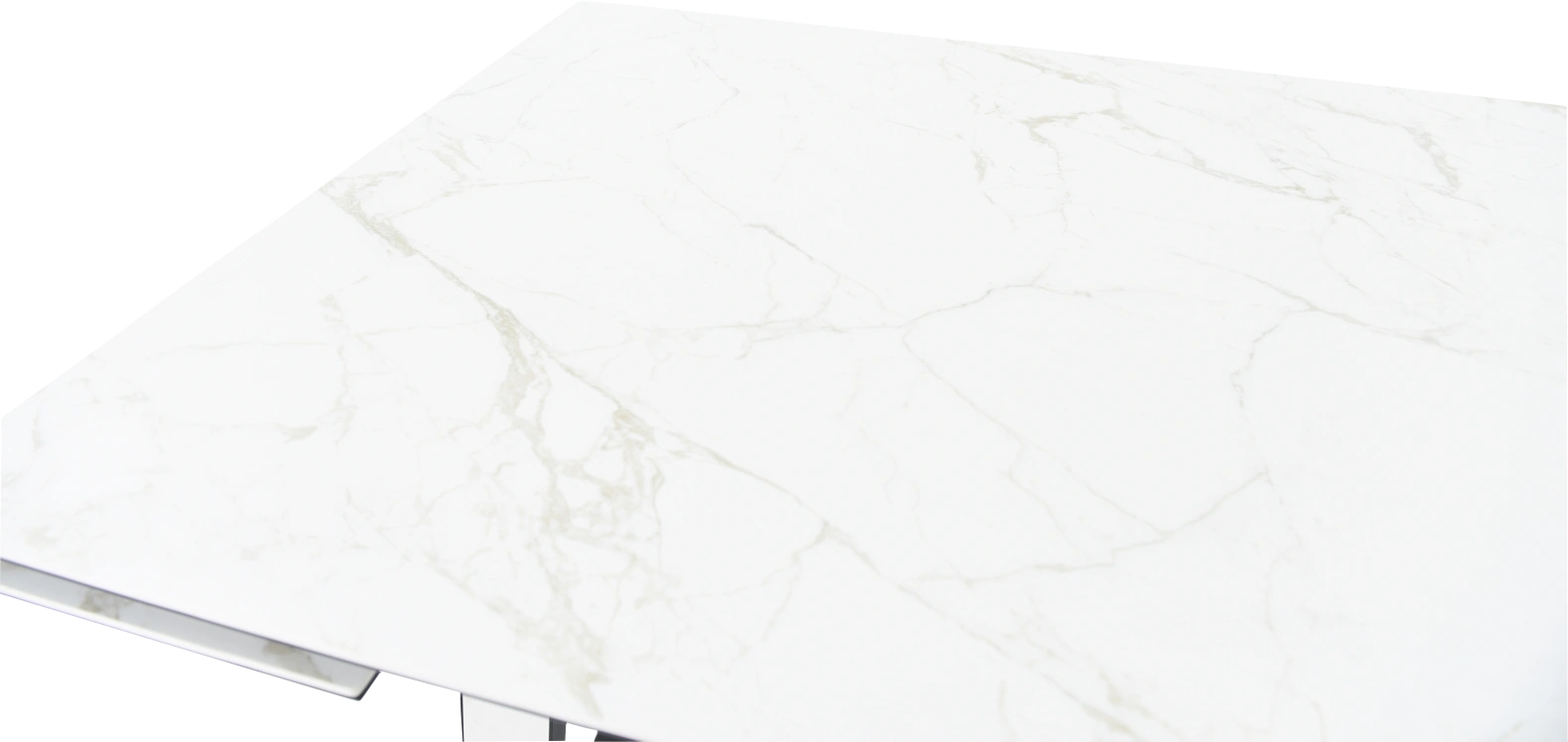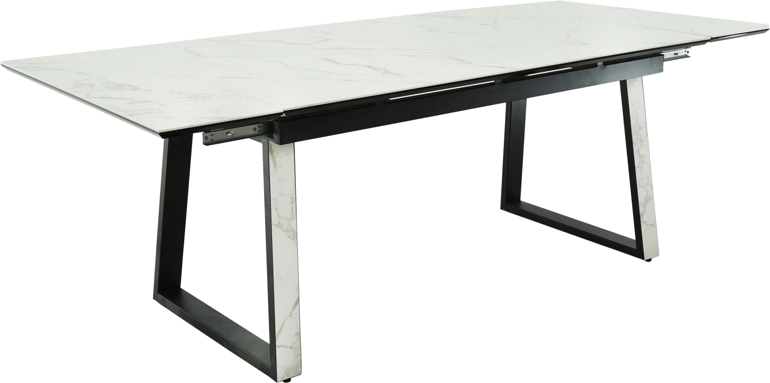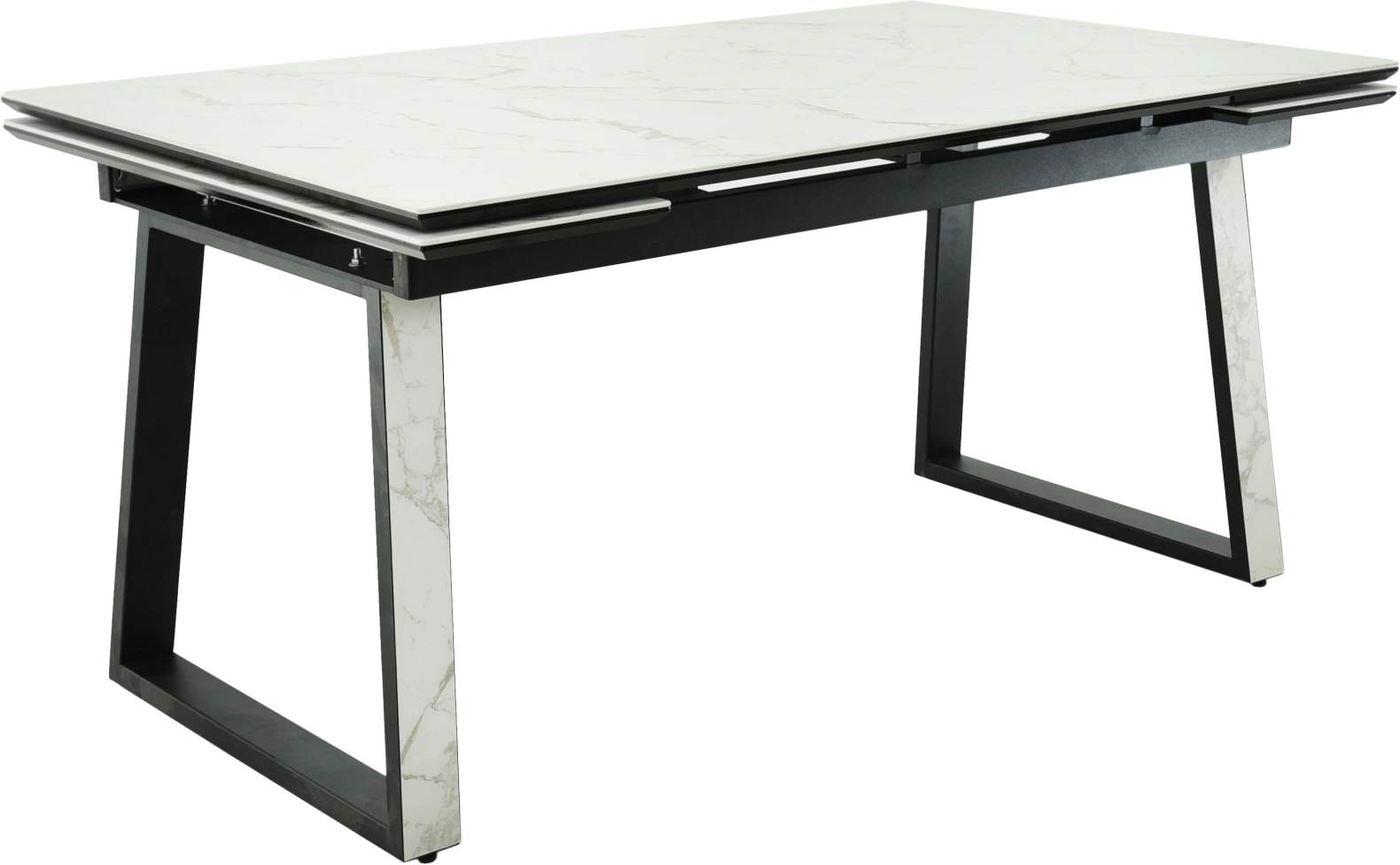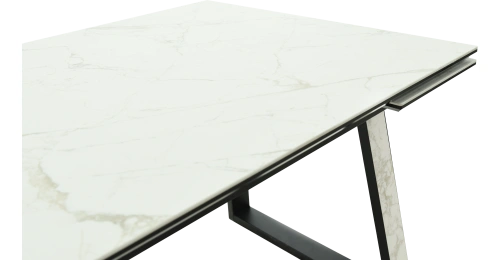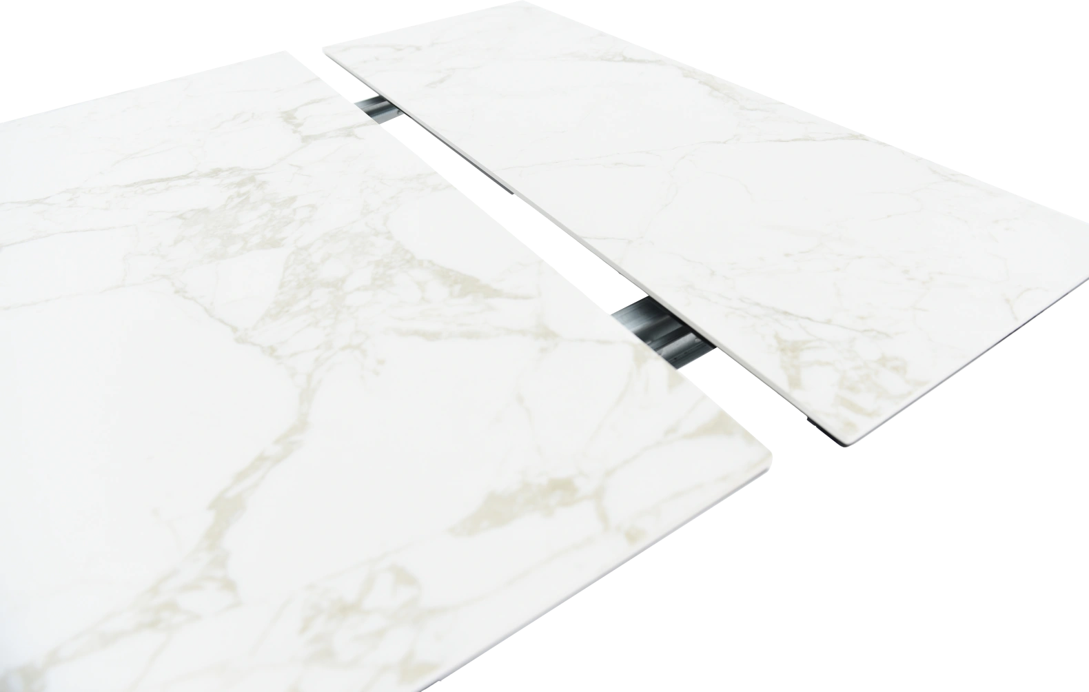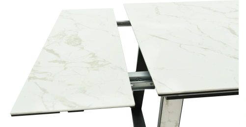 Кухонный стол «Monaco» Quadro, со столешницей из искусственного камня, материал - керамогранит Calcata vaglioro, на черных металлических опорах. Отличительной чертой этого стола являются боковые вставки для раскладки стола. Такой механизм успешно себя зарекомендовал и пользуется постоянным спросом у наших покупателей. На вставках опор, также используется керамогранит. Стоит отметить еще одну особенность стола «Monaco» Quadro — это выбор, как со столешницей из керамогранита, так и покрытия из закаленного, матового стекла OPTI. На столы с керамикой, между столешницей и вставкой, приклеивается силиконовая полоска, она необходима для сохранения целостности керамики при трансформации стола.