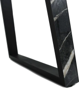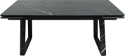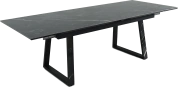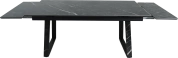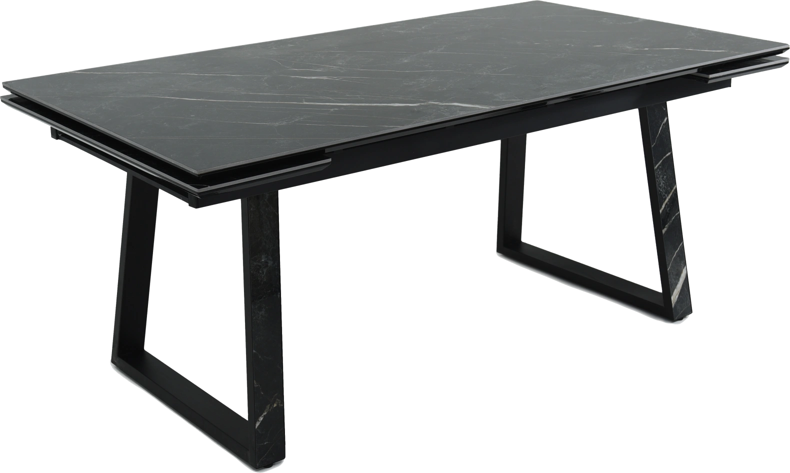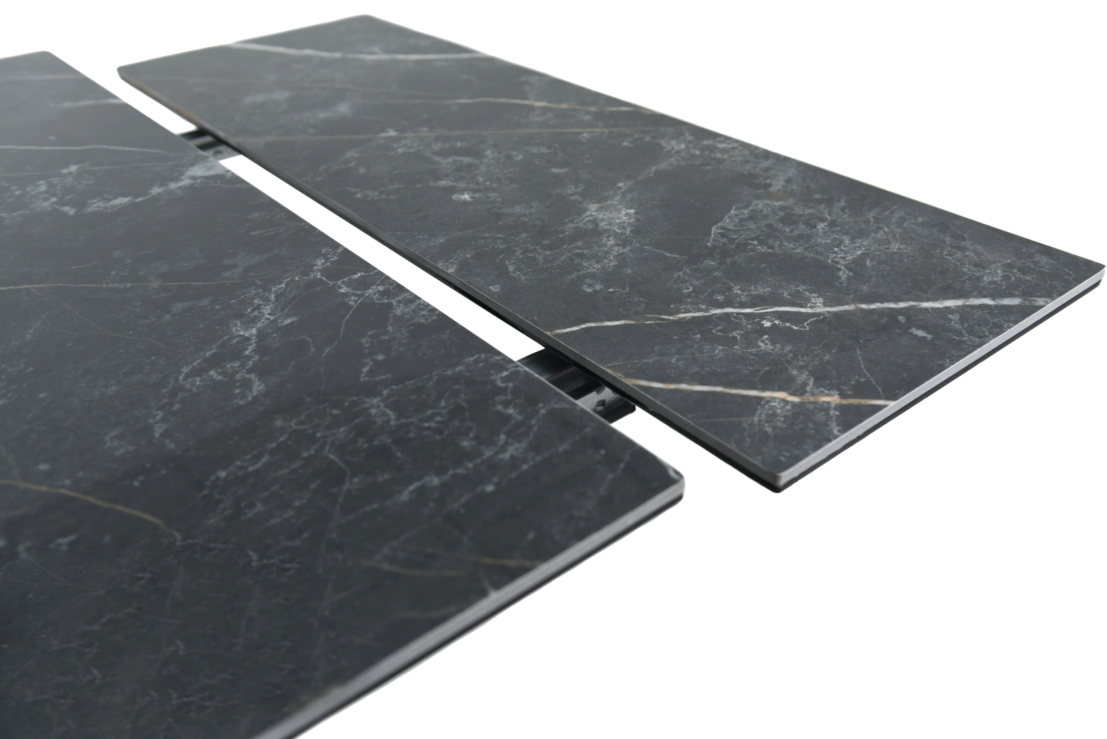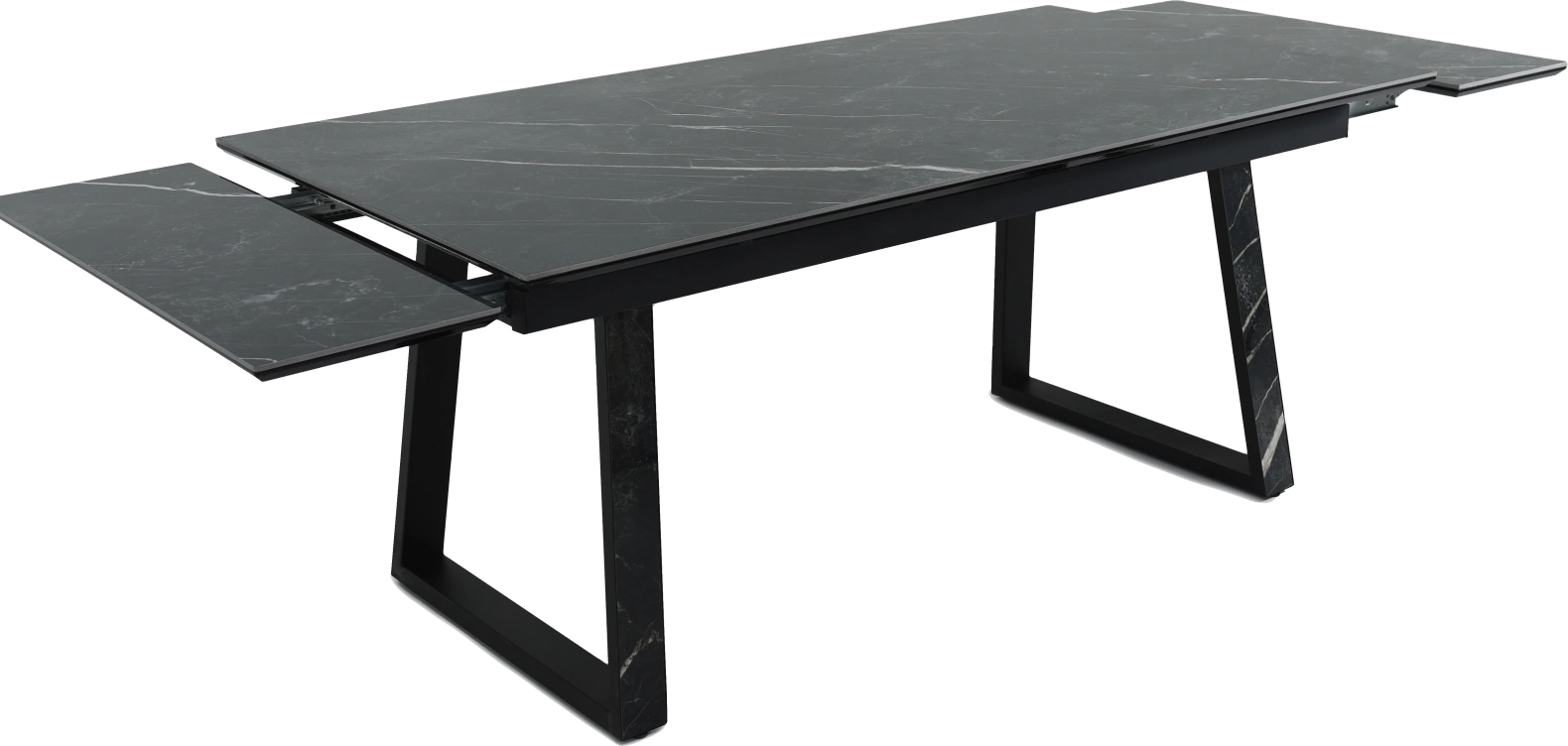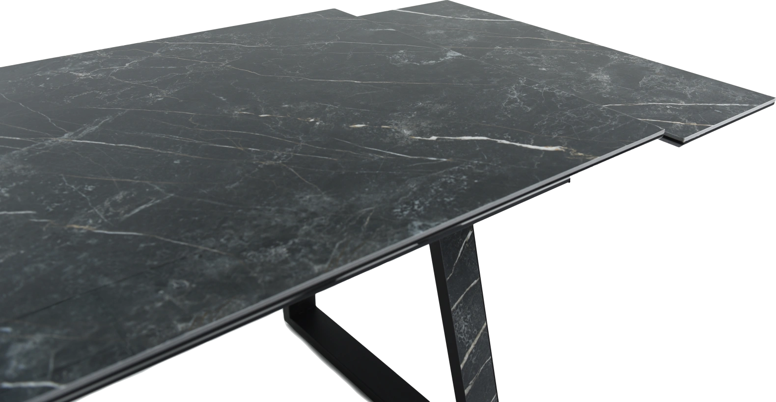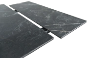 Кухонный стол «Monaco» Quadro, со столешницей из искусственного камня, материал - керамогранит Noir desir Bocciardato, на черных металлических опорах. Отличительной чертой этого стола являются боковые вставки для раскладки стола. Такой механизм успешно себя зарекомендовал и пользуется постоянным спросом у наших покупателей. На вставках опор, также используется керамогранит. Стоит отметить еще одну особенность стола «Monaco» Quadro — это выбор, как со столешницей из керамогранита, так и покрытия из закаленного, матового стекла OPTI. На столы с керамикой, между столешницей и вставкой, приклеивается силиконовая полоска, она необходима для сохранения целостности керамики при трансформации стола.
