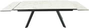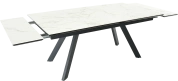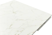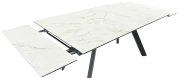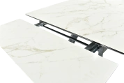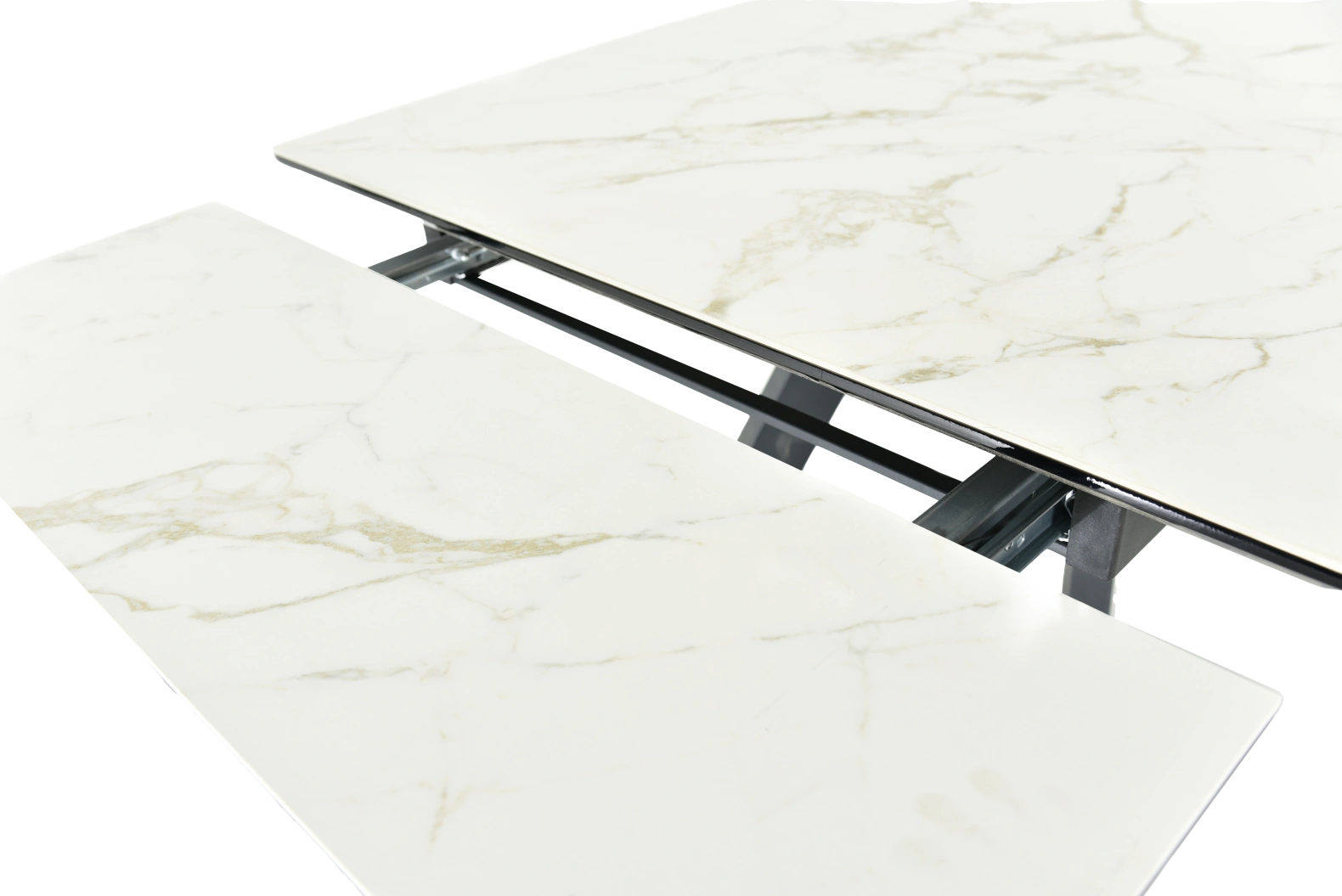Кухонный стол «Monaco» со столешницей из искусственного камня, материал - керамогранит Calacata vaglioro, на черных металлических опорах. Отличительной чертой этого стола являются боковые вставки для раскладки стола. Такой механизм успешно себя зарекомендовал и пользуется постоянным спросом у наших покупателей. Стоит отметить еще одну особенность стола «Monaco» — это выбор, как со столешницей из керамогранита, так и покрытия из закаленного, матового стекла OPTI. На столы с керамикой, между столешницей и вставкой, приклеивается силиконовая полоска, она необходима для сохранения целостности керамики при трансформации стола.