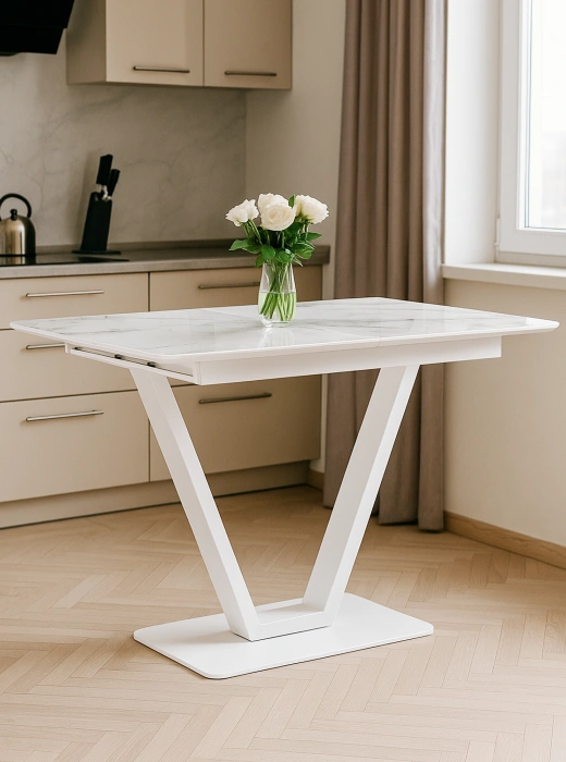 Стол на тумбе Бугун -это прекрасный пример современного и функционального стола. Каркас и ножки стола выполнены из металла, что делает его прочным и устойчивым. Прямоугольная столешница из МДФ и стекла создает эффект легкости и простора в помещении. Благодаря механизму раскладывания, стол может быть легко расширен до 160 см, что делает его очень удобным и практичным. Ножка -тумба в форме буквы V добавляет столу индивидуальности и изысканности. Этот стол идеально подойдет для создания современного и стильного интерьера.