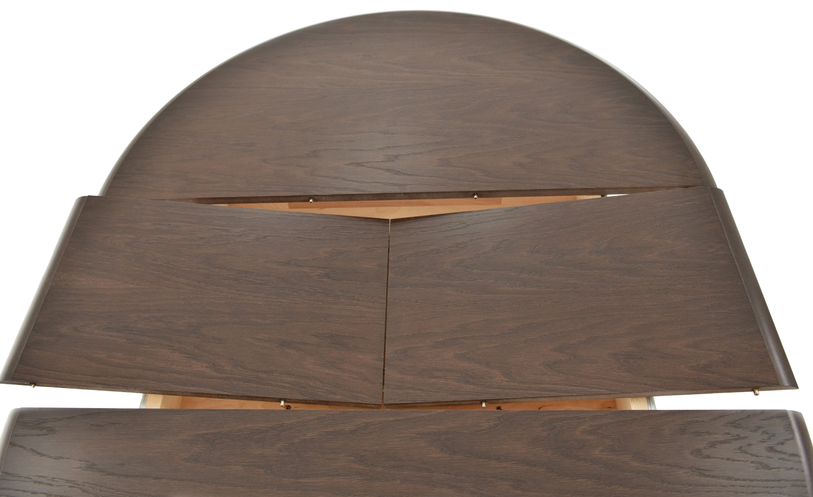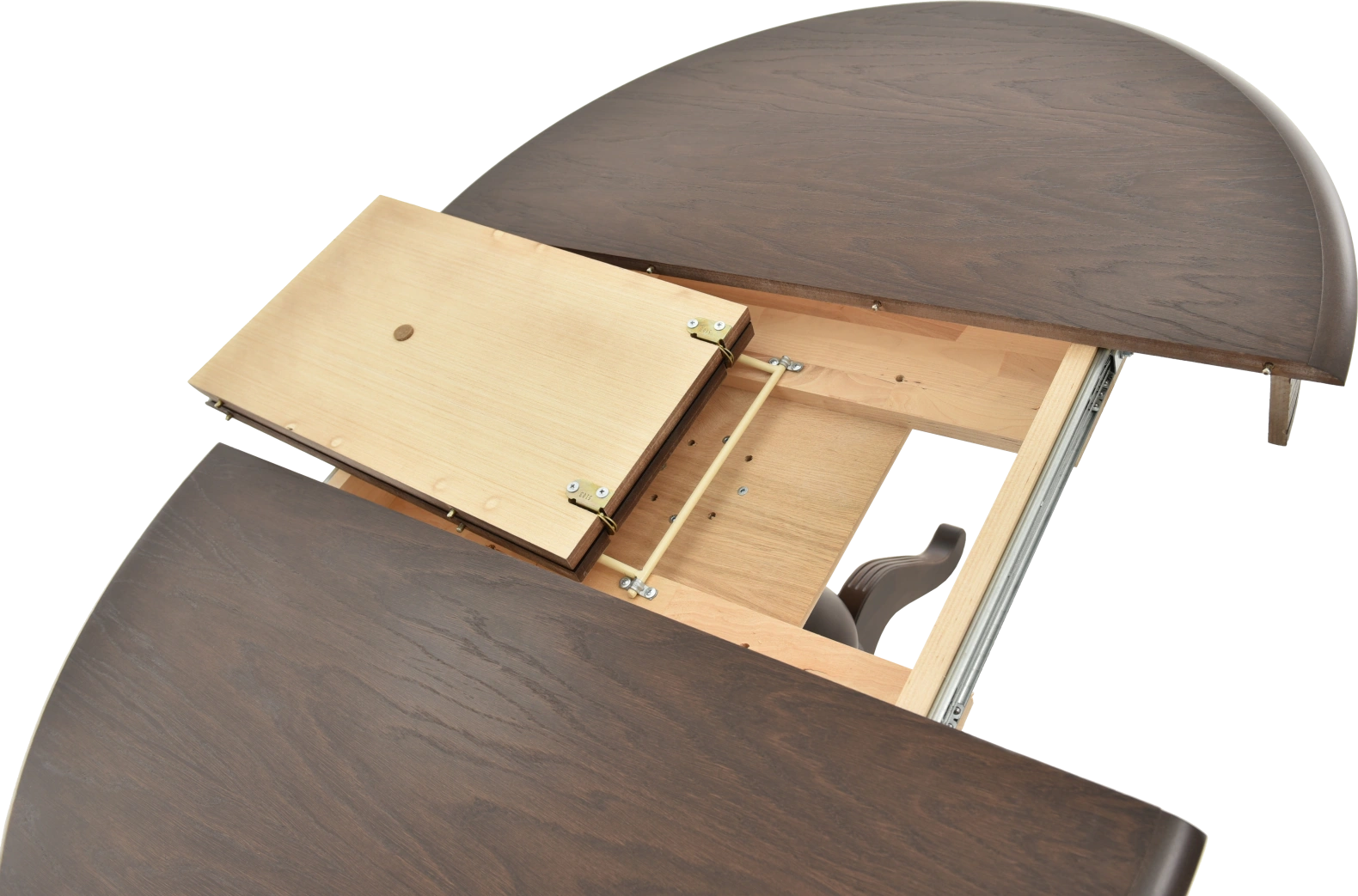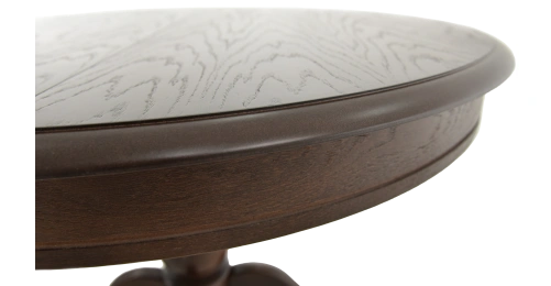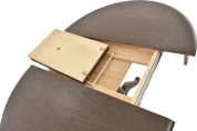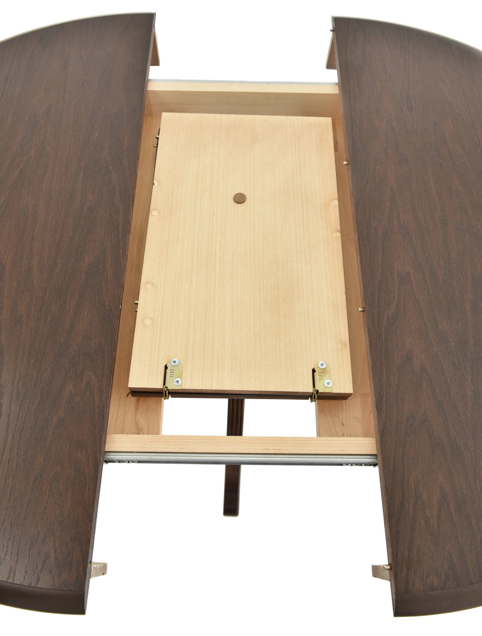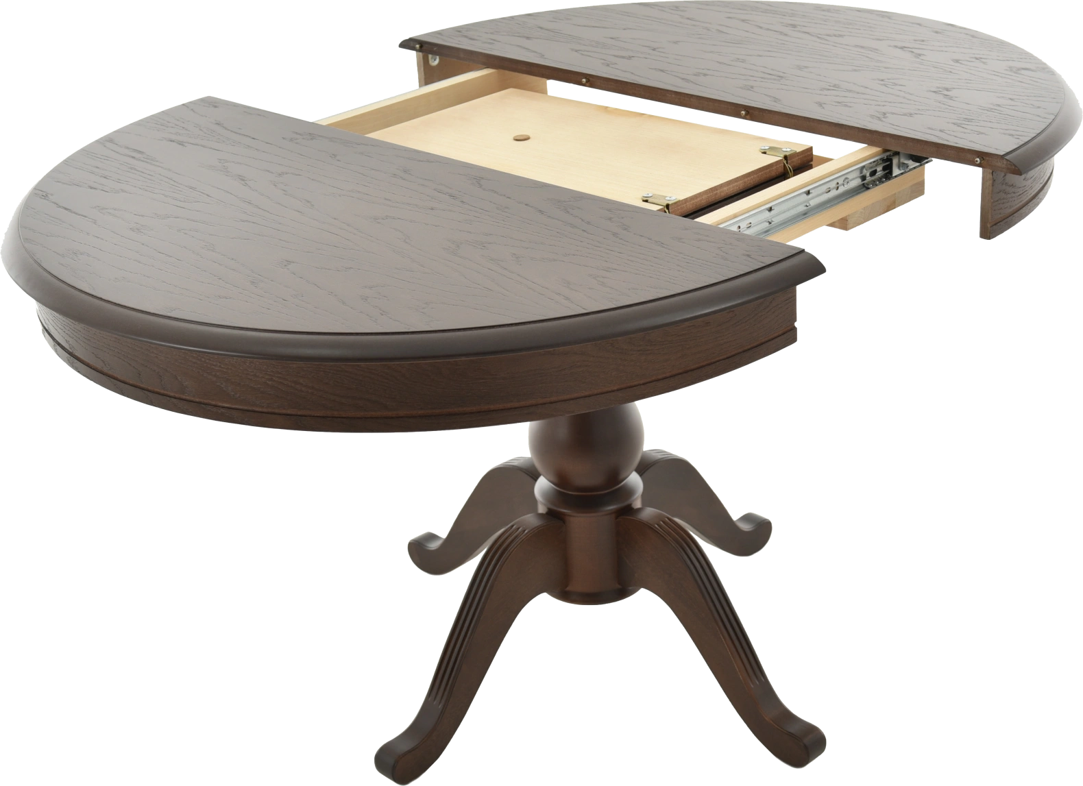 Материал изготовления подстолья: МДФ с покрытием из шпона. Ножка круглого раздвижного стола изготовлена из массива и совпадает с цветом столешницы. Габариты стола позволяют расположить его в любой квартире или доме, вне зависимости от их размера.