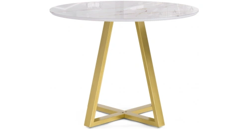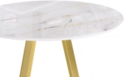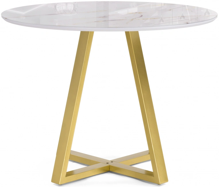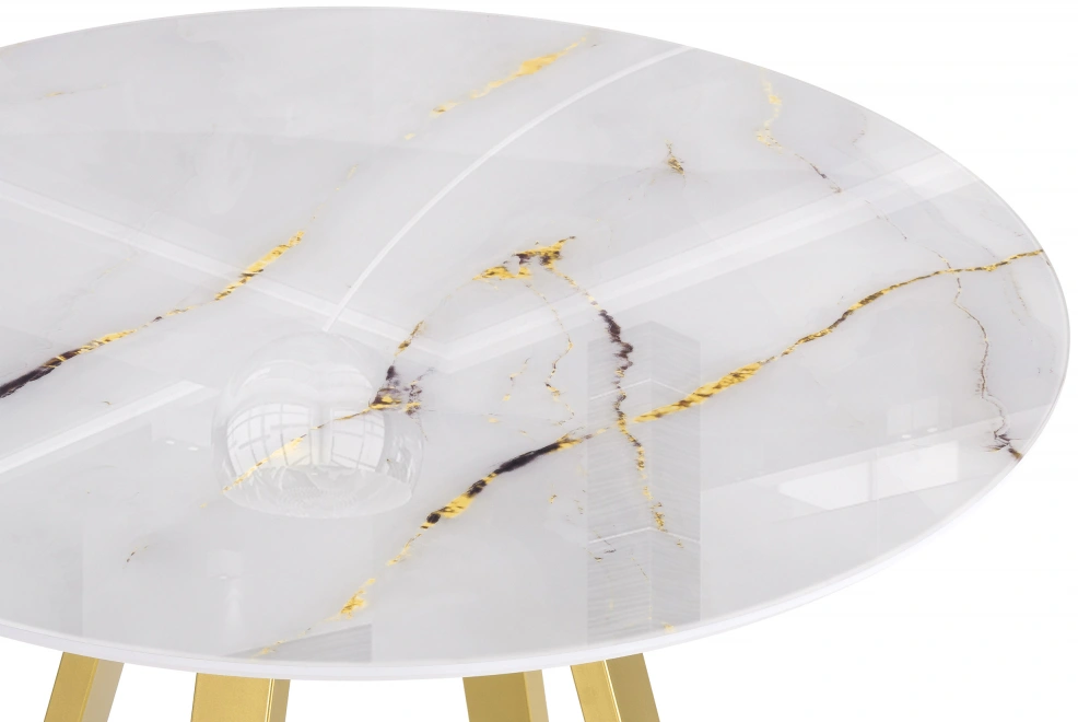 Толщина столешницы: 2 мм. Материал каркаса - Металл; Материал ножек - Металл; Материал столешницы - Стекло / МДФ; Цвет каркаса - Золотой; Цвет ножек - Золотой; Цвет столешницы - Белый; Цвет подстолья - Белый; Ширина - 100; Высота - 78; Длина - 100;