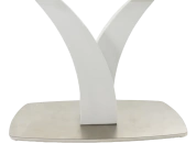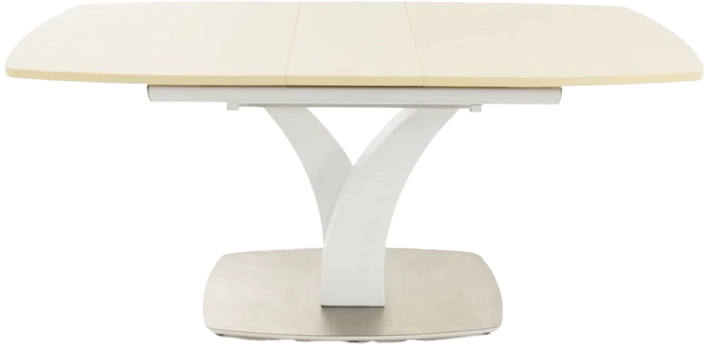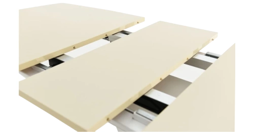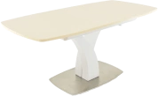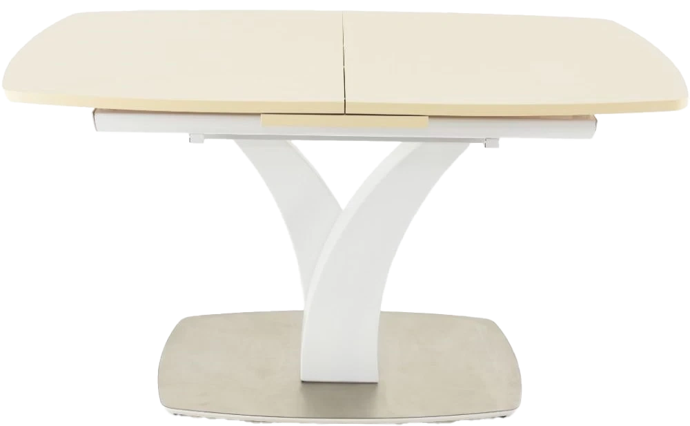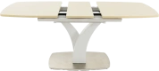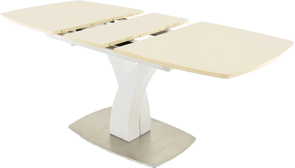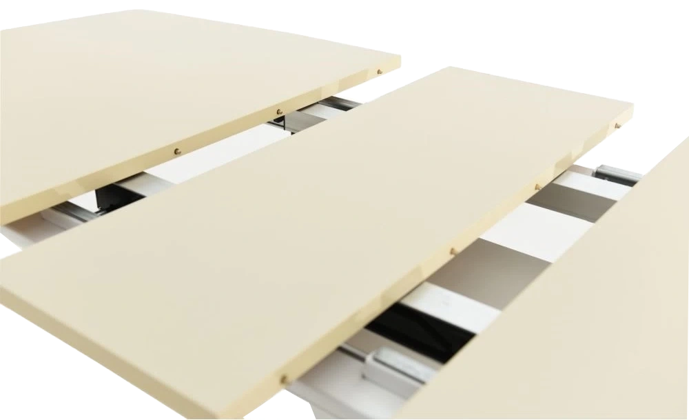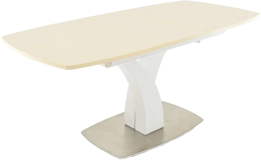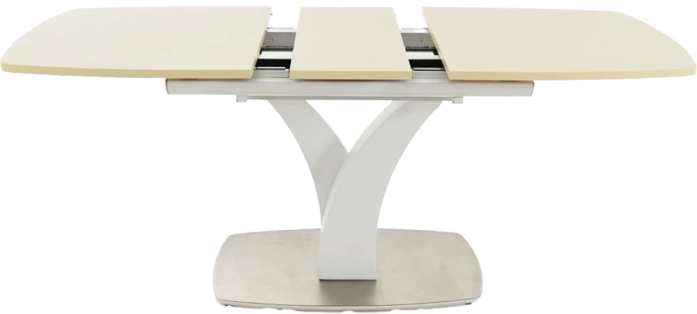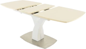Стол раздвижной, механизм синхронной раскладки — с подъемным механизмом, причем покрытие вкладыша так же изготовлено из закалённого стекла, что позволяет столу не терять эстетической окраски даже в разложенном варианте. Длина стола со вставкой: 180 см.