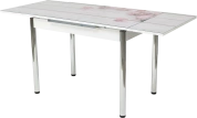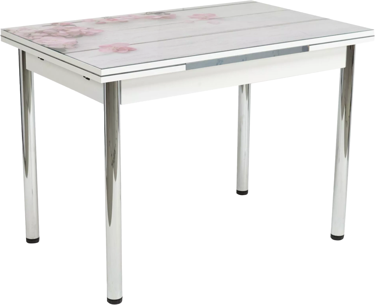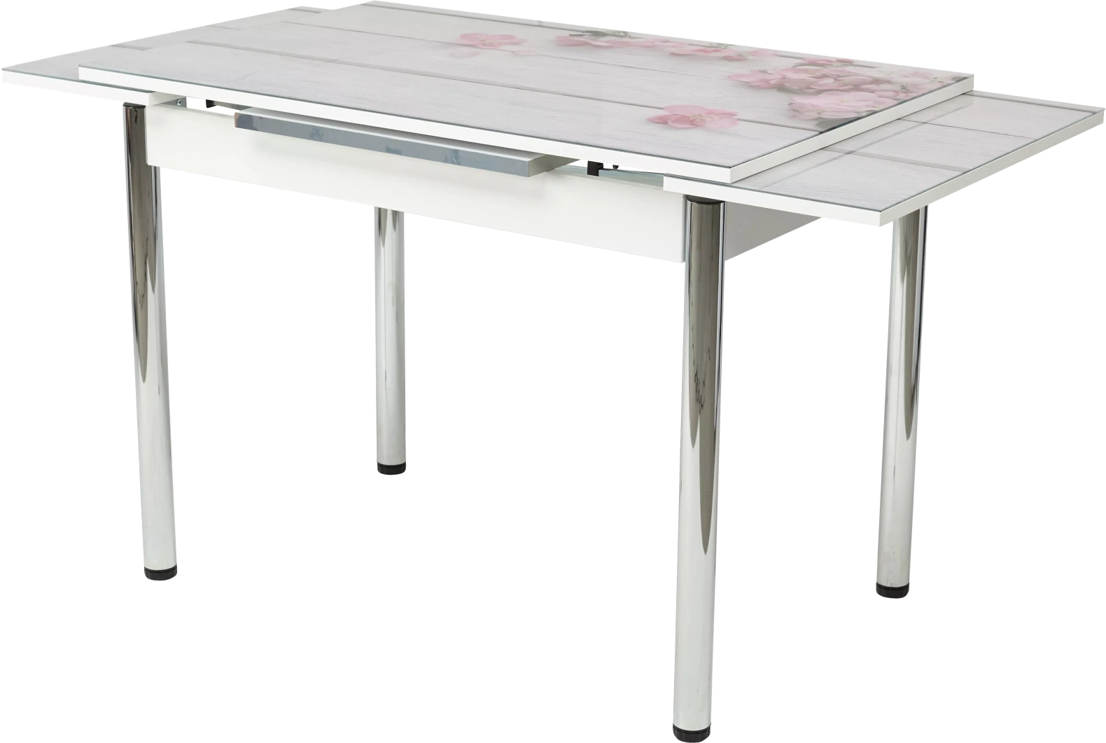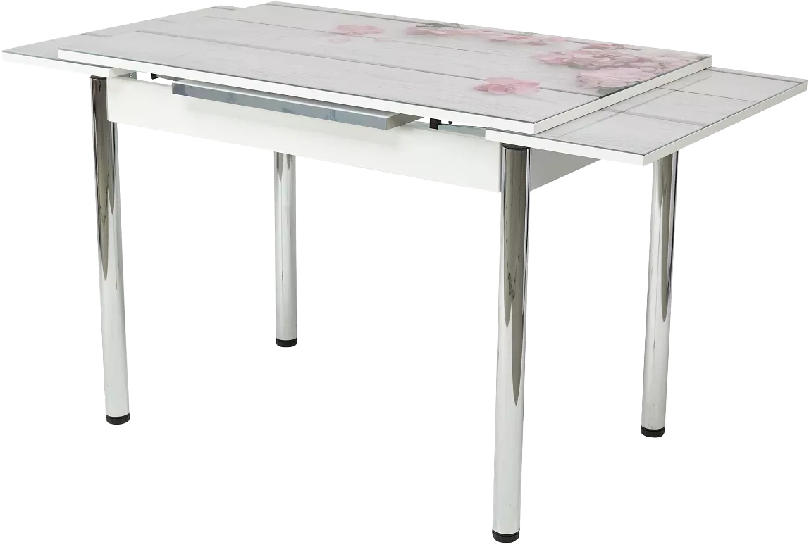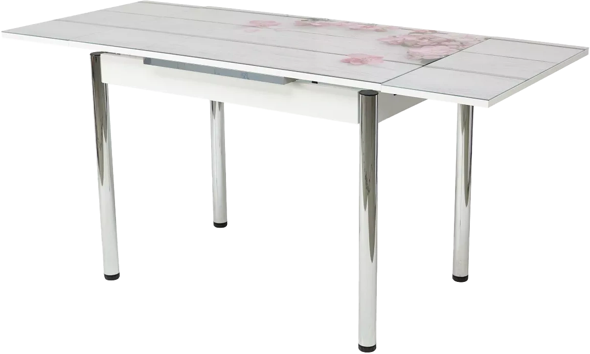 Кухонный раскладной белый стол из закаленного глянцевого стекла с рисунком (фотопечать) + МДФ. Ножки хром. Две вставки по 30 см с торцов, выдвигаются из-под столешницы.