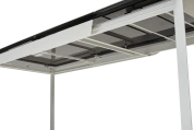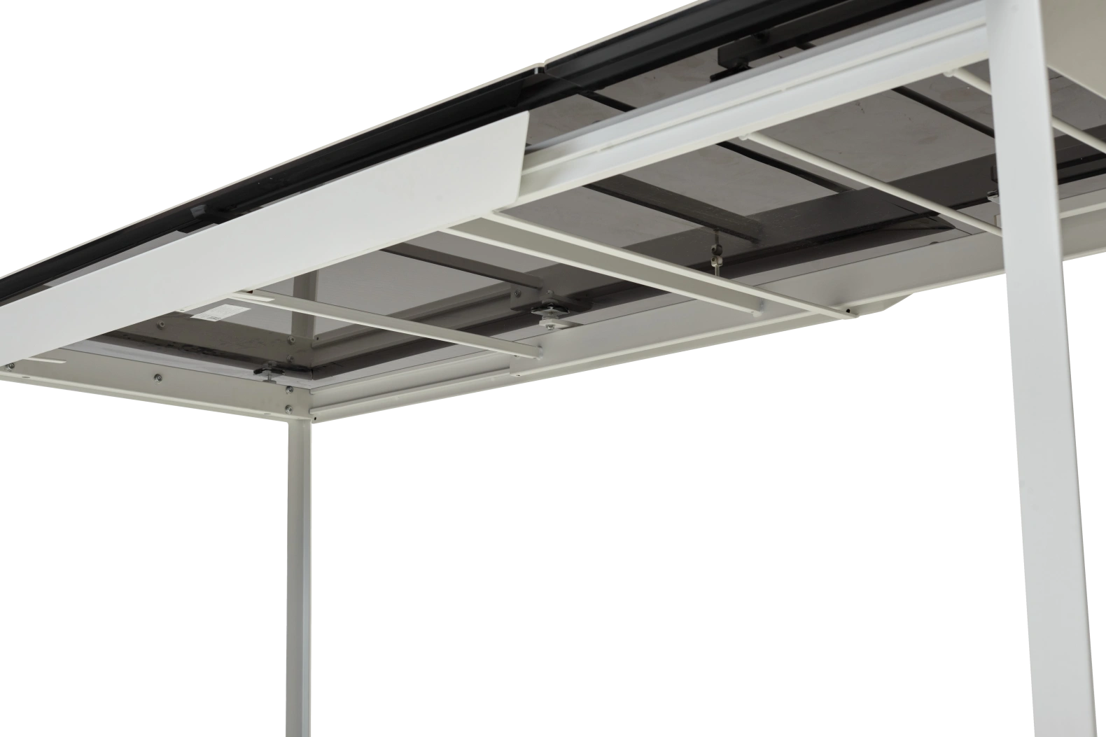 - основание стола - металл, цвет - белый, ножки стола расположены по углам столешницы под углом;