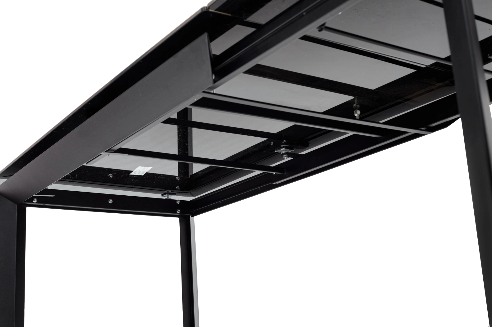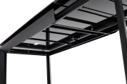 - основание стола - металл, цвет - черный, ножки стола расположены по углам столешницы под углом;