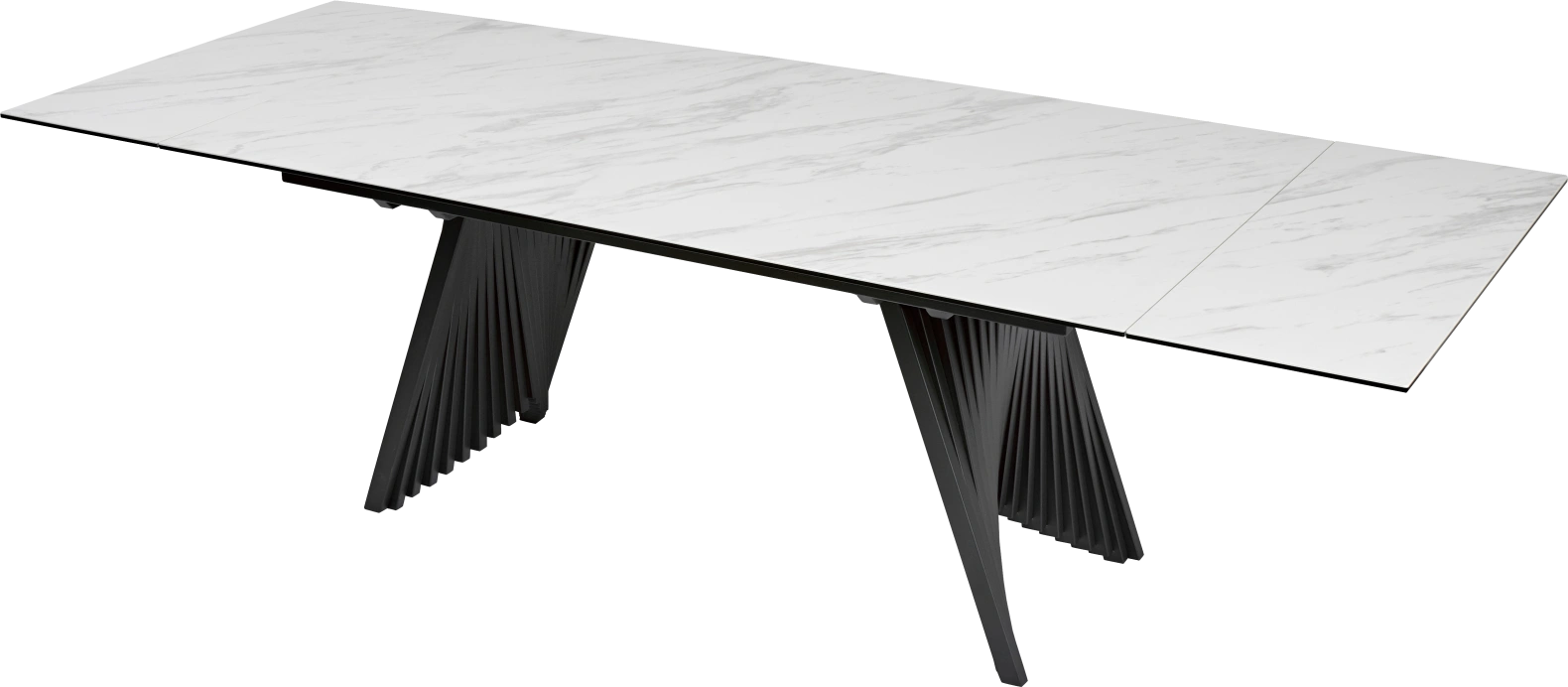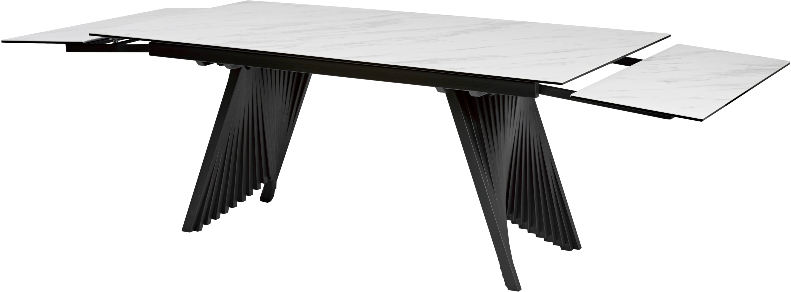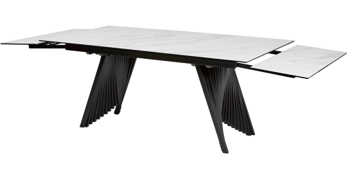 - двухсторонняя торцевая система раскладывания, две независимые вставки по 50 см позволяют увеличить длину столешницы на 250 или 300 см при необходимости;