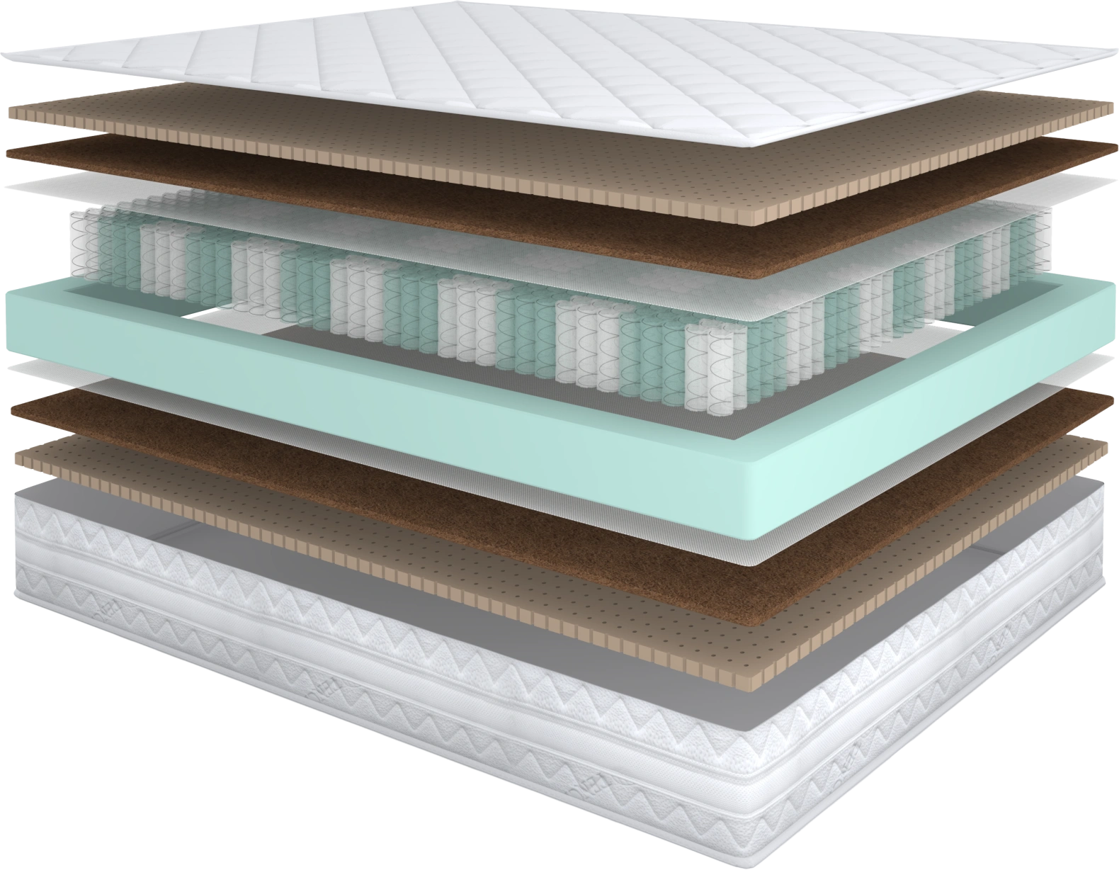 Матрас одинаковой жесткости с очень упругим перфорированным латексом (натуральный, вспененный сок гевеи) сверху и комфортным слоем кокосовой койры снизу. Слой кокосовой койры над независимыми пружинами обеспечивает длительную эксплуатацию матраса с сохранением анатомических свойств.