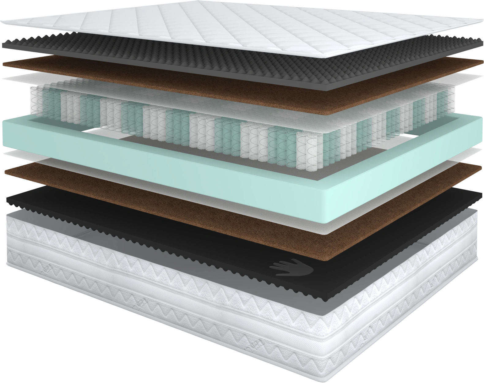Адсорбирующий меморикс высокой плотности, с угольной пропиткой, обладает эффектом «массажного облака», а также независимый, чувствительный пружинный блок (более чем 1000 пружин на спальное место) и слой натурального кокоса подарят достойный уровень комфорта и естественного оздоровления в процессе сна.