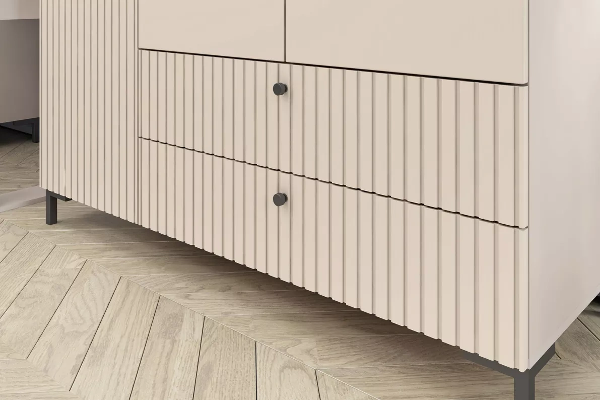 корпуса закромлены кромками ПВХ и ABS. Фасады изготовлены из 19 мм МДФ плиты цвет, укрытой пленкой ПВХ с эффектом Soft Touch.