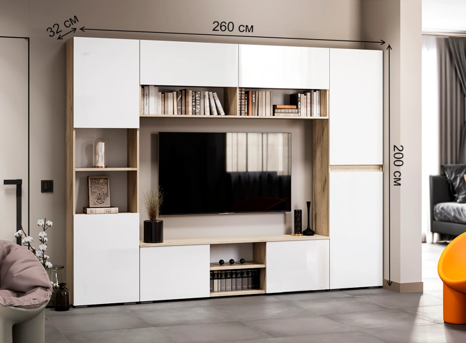 Модульная гостиная Алетра, комплектация 2, дуб крафт серый / глянец белый