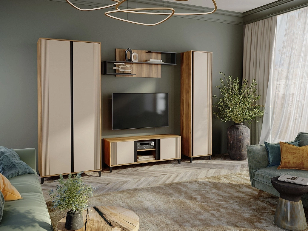 Стильная и современная модульная гостиная "Богемия" изготовлена из высококачественных материалов. Корпус изготовлен из ламинированной древесностружечной плиты толщиной 16мм. Фасады выполнены из МДФ толщиной 19мм и покрыты пленками ПВХ с эффектом Soft touch. Это обеспечивает не только стильный внешний вид, но и приятные тактильные ощущения. Цвета фасадов - зеленый и бежевый, гармонично сочетаются друг с другом и с корпусом мебели. Дизайн гостиной подчеркивает эффектный контраст материалов и цветов.